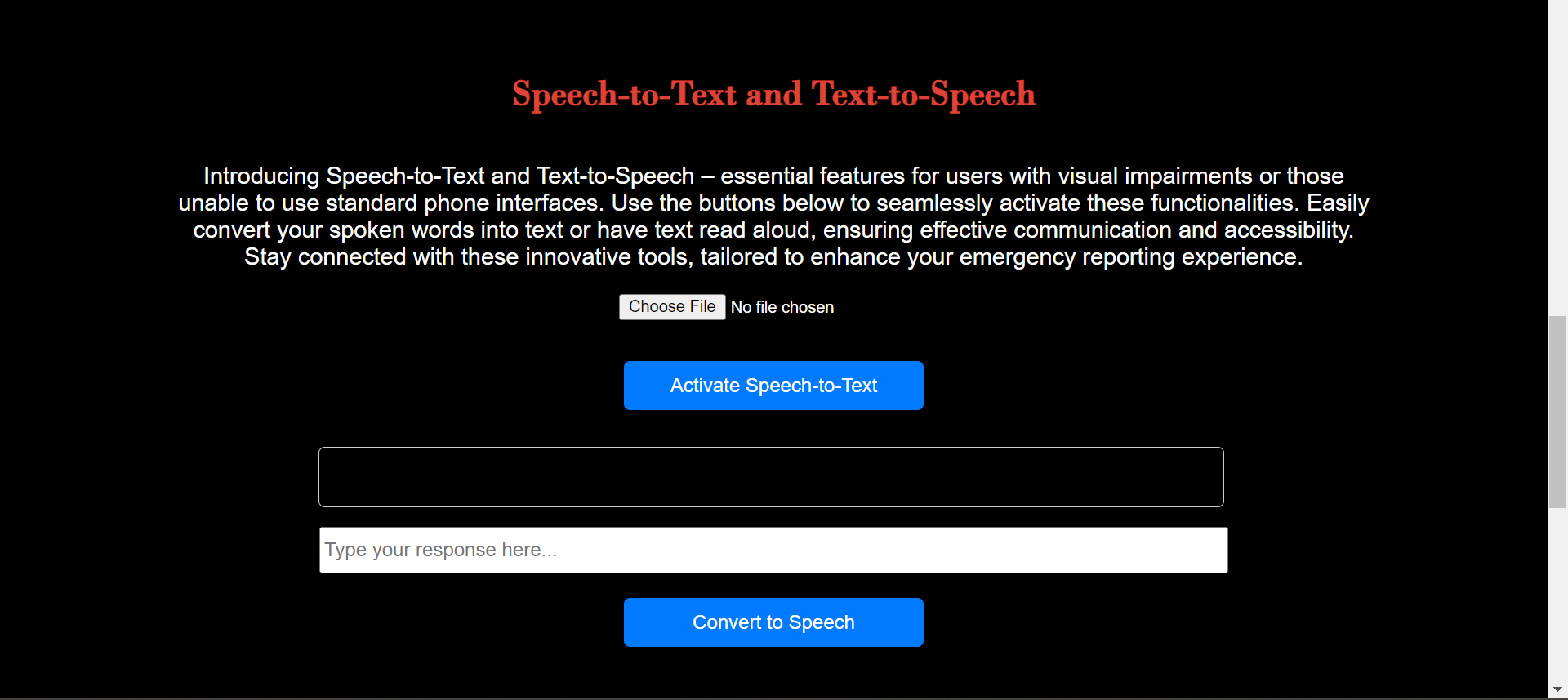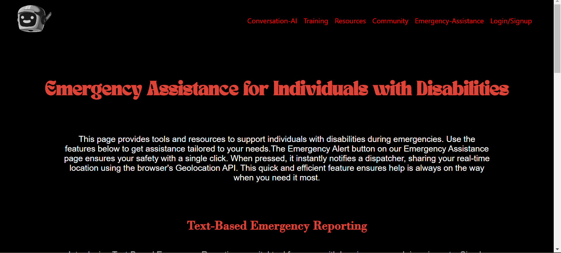From the outset, our vision was ambitious. We wished to create a web application that could accommodate the needs of our primary stakeholders - dispatchers, along with our critical stakeholders - disabled individuals, through an AI that supports both dispatchers and individuals. We envisioned an Emergency Assistance Page that catered to those who have difficulty speaking, hearing, or communicating due to movement impairment. We understood their specific needs and ensured that help could be dispatched efficiently.