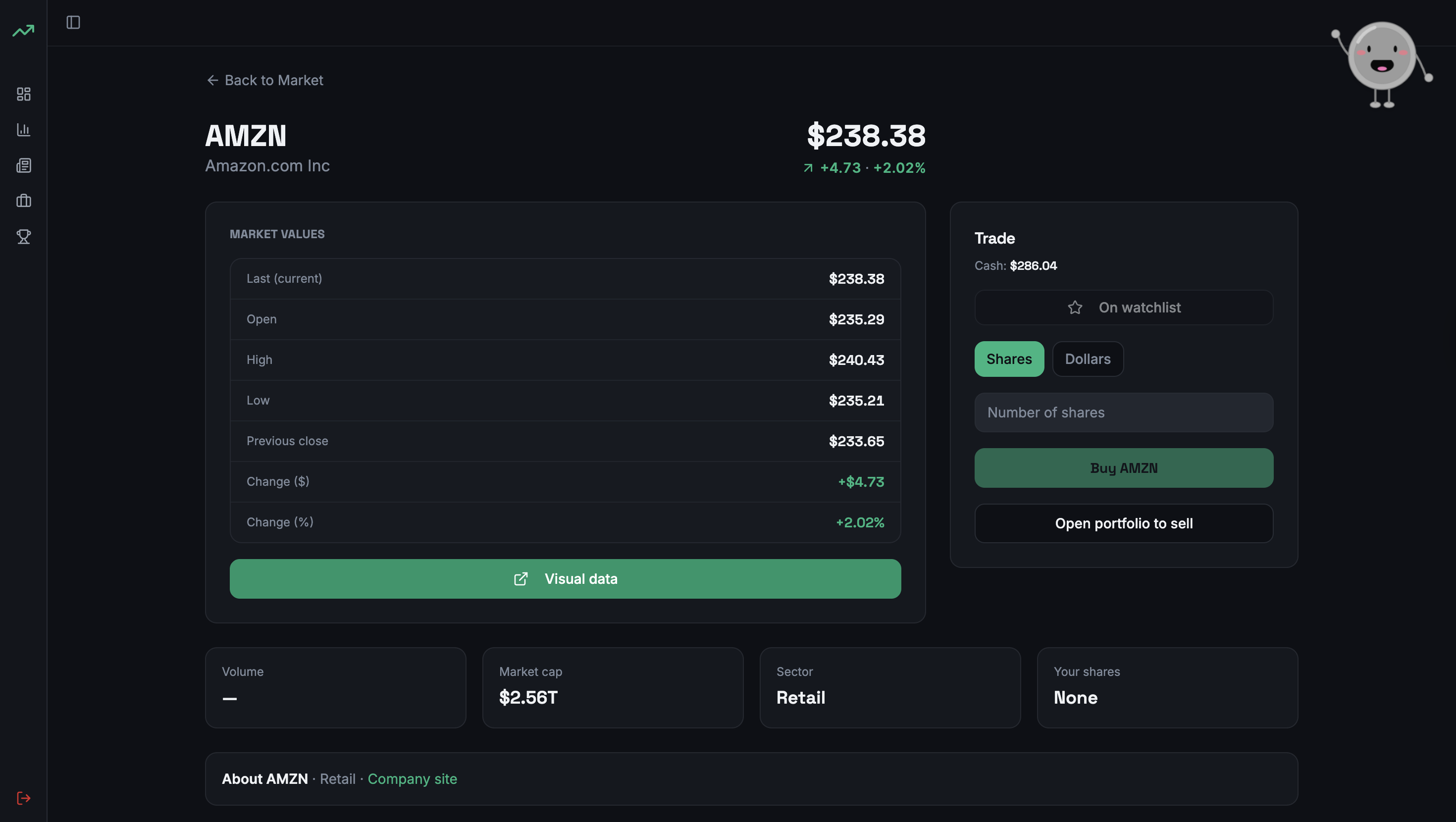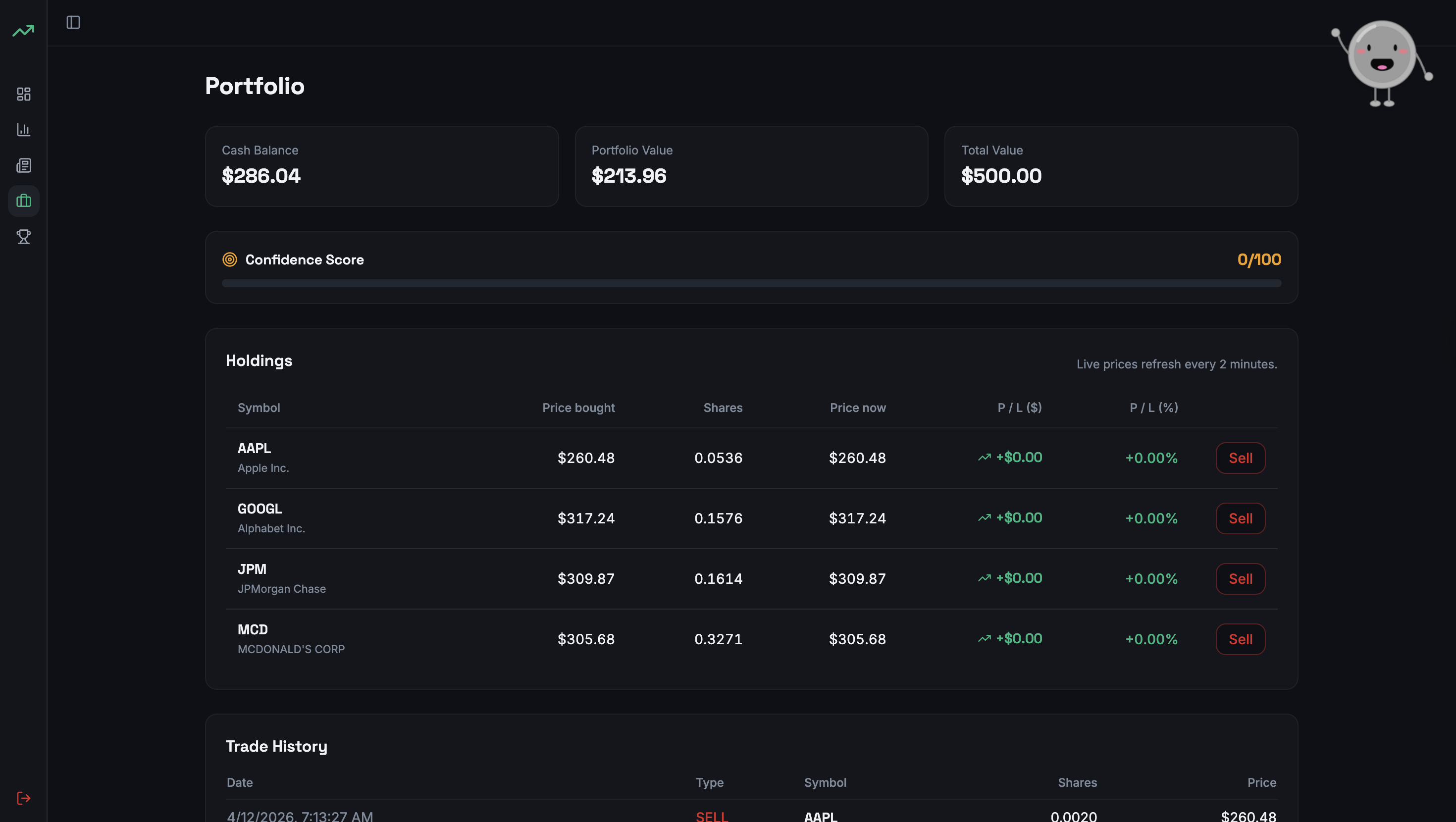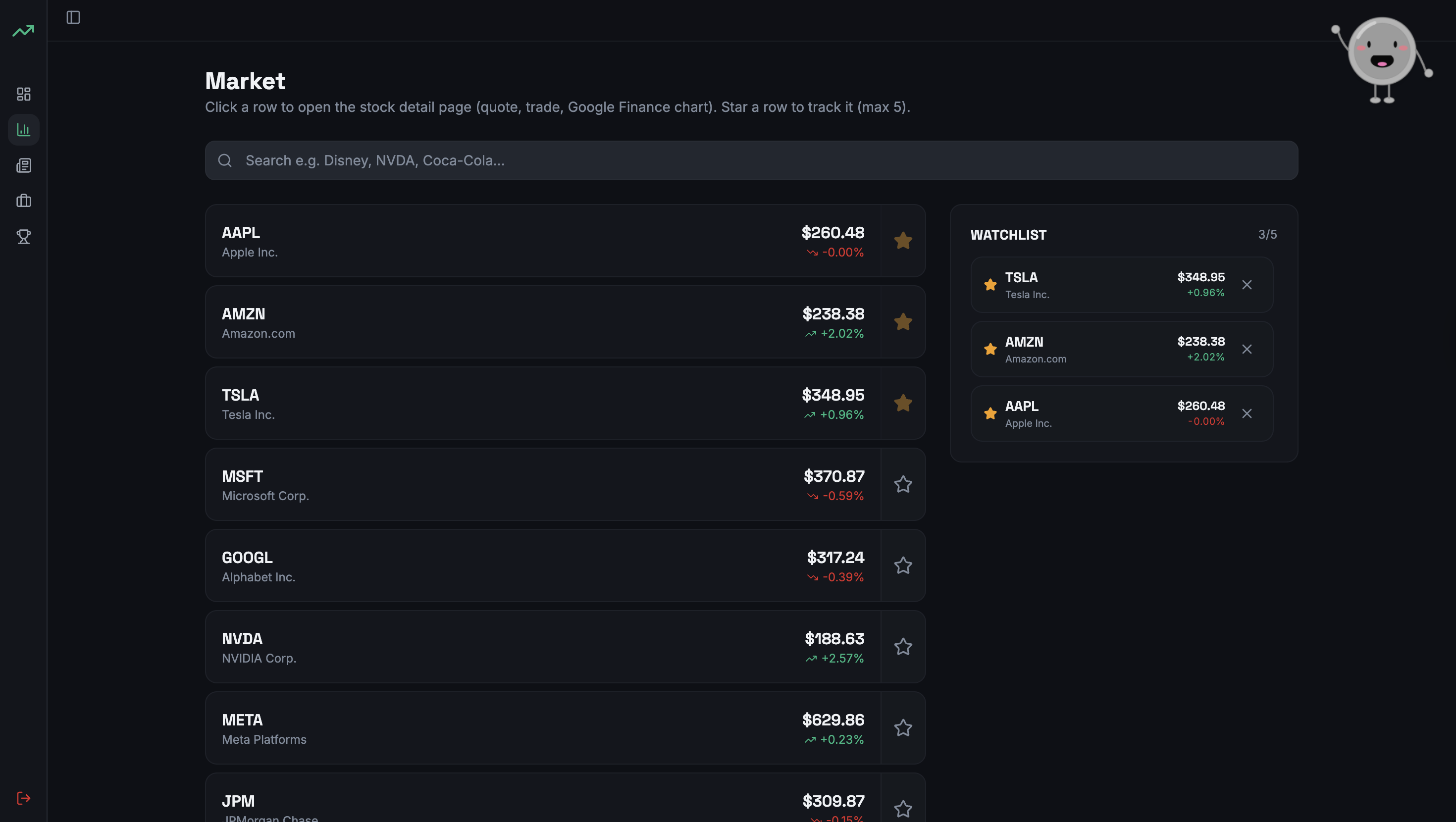 We fetch live market data from Finnhub to simulate real trading in real time. The platform is designed to be simple enough for beginners but still useful for anyone at any experience level to learn and practice investing safely. We also built an interactive mascot to make the experience more engaging and easy to follow. As CS majors, we learned a lot about finance while building the UI and focusing on making it clean, intuitive, and user-friendly.