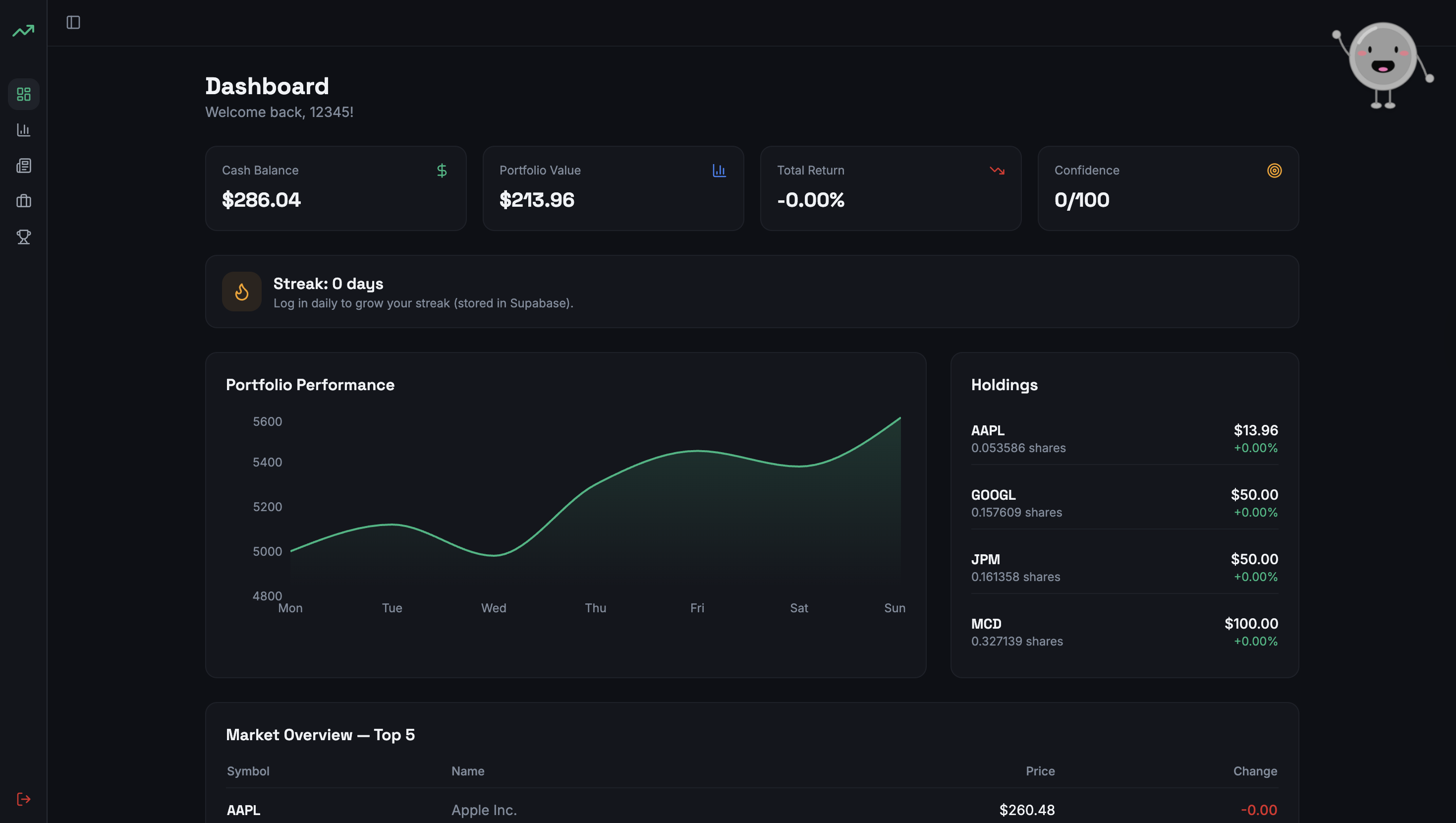 We learned how to set up and integrate Supabase for authentication and backend services. We also explored adding animations.Through the project, we also gained a slightly better understanding of basic trading concepts and how market simulations work.