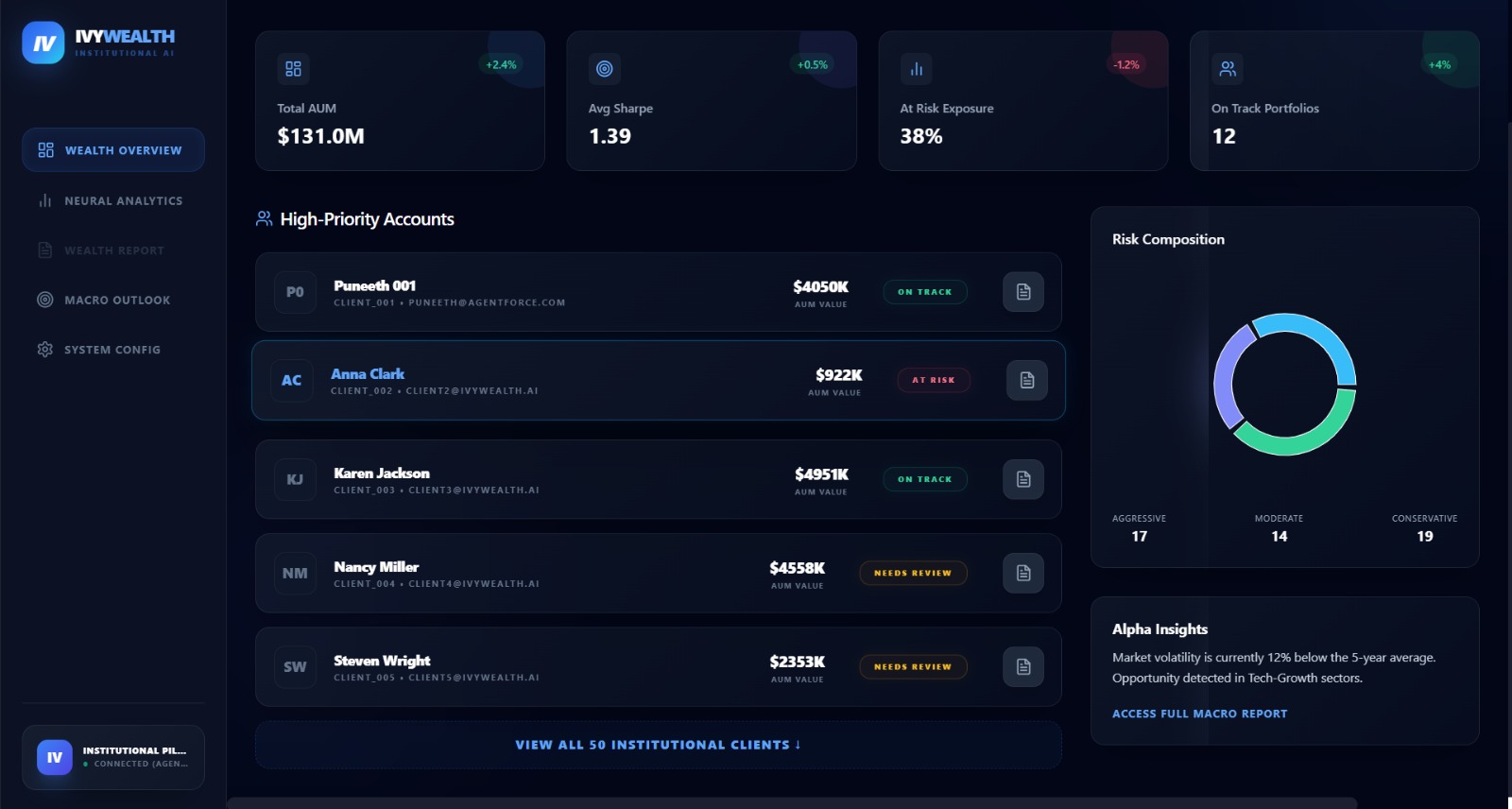 Wealth AI (Institutional Portfolio Orchestrator) is a unified platform that transforms raw client and market data into actionable investment intelligence.