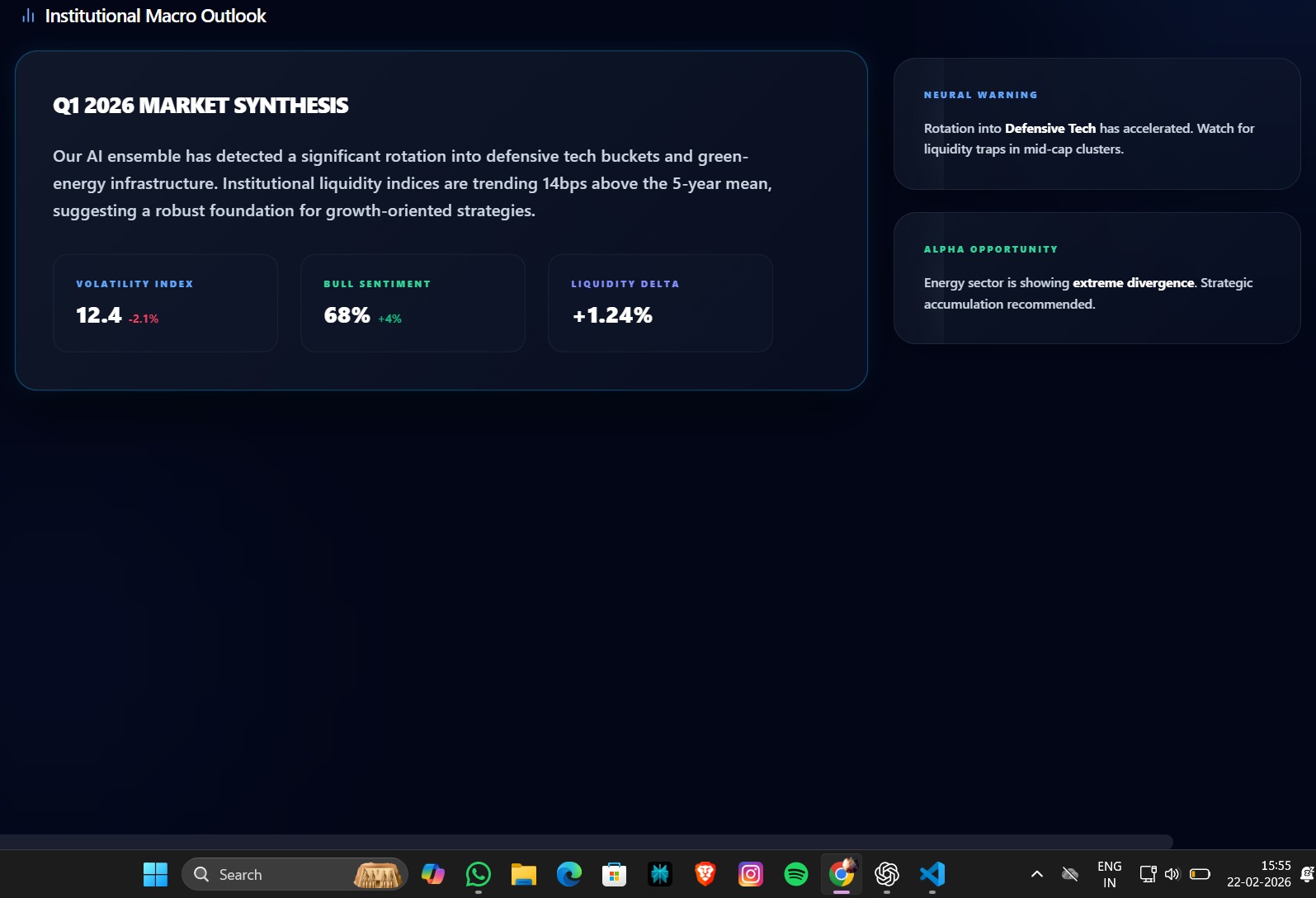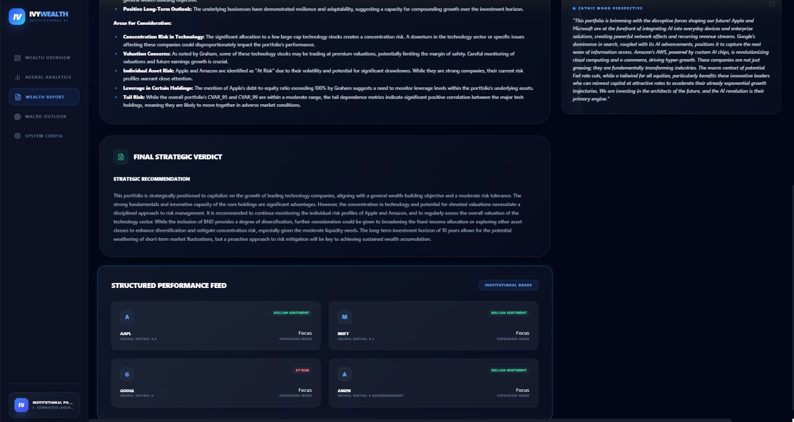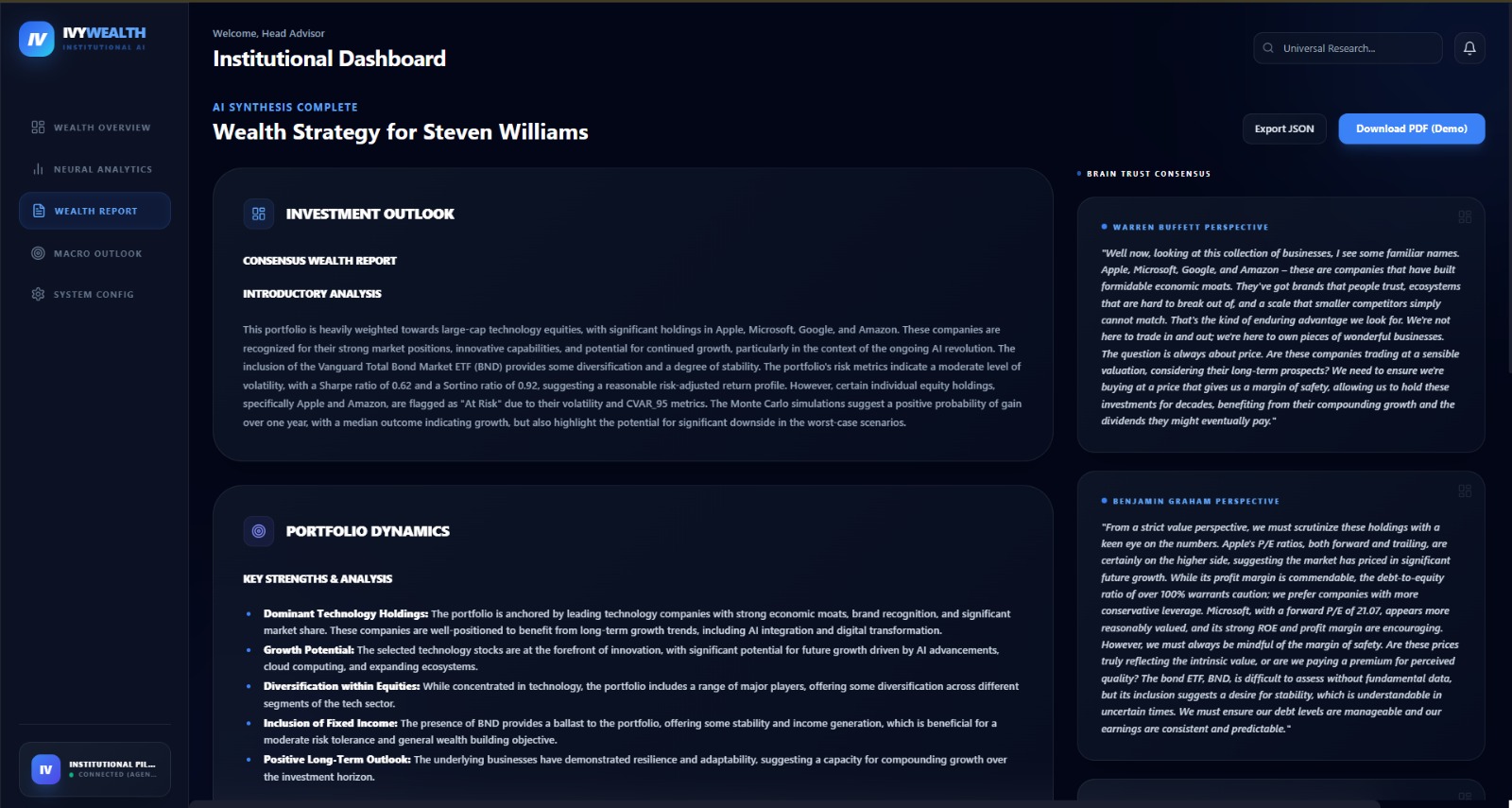 We envisioned Wealth AI—a platform that simulates an institutional investment committee within software. Instead of relying on spreadsheets and intuition, advisors can generate fiduciary-grade insights instantly through orchestrated AI agents and quantitative models.