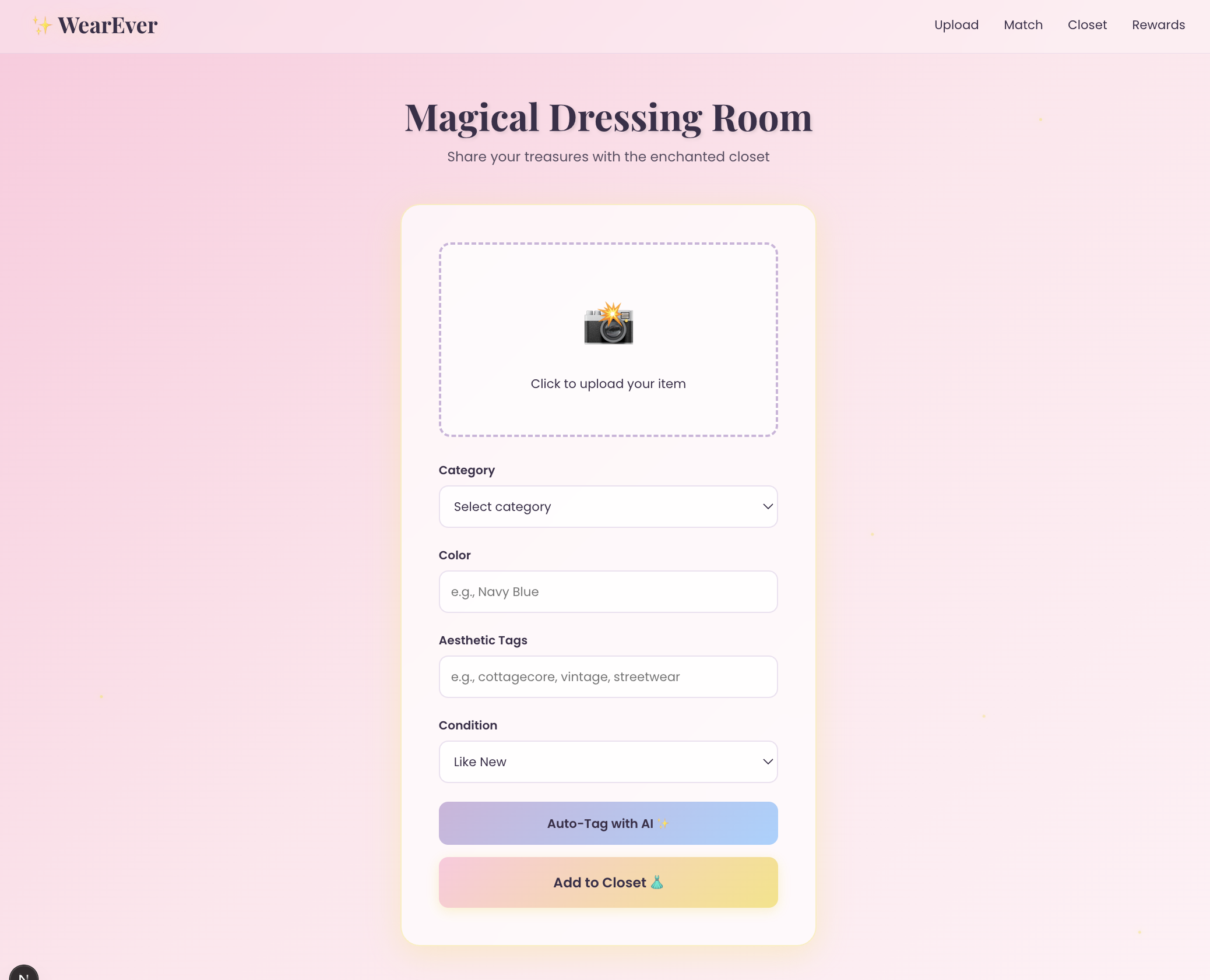 We built WearEver using Next.js for structure and interface design, and custom CSS modules for a clean, flexible, fairytale-inspired look.