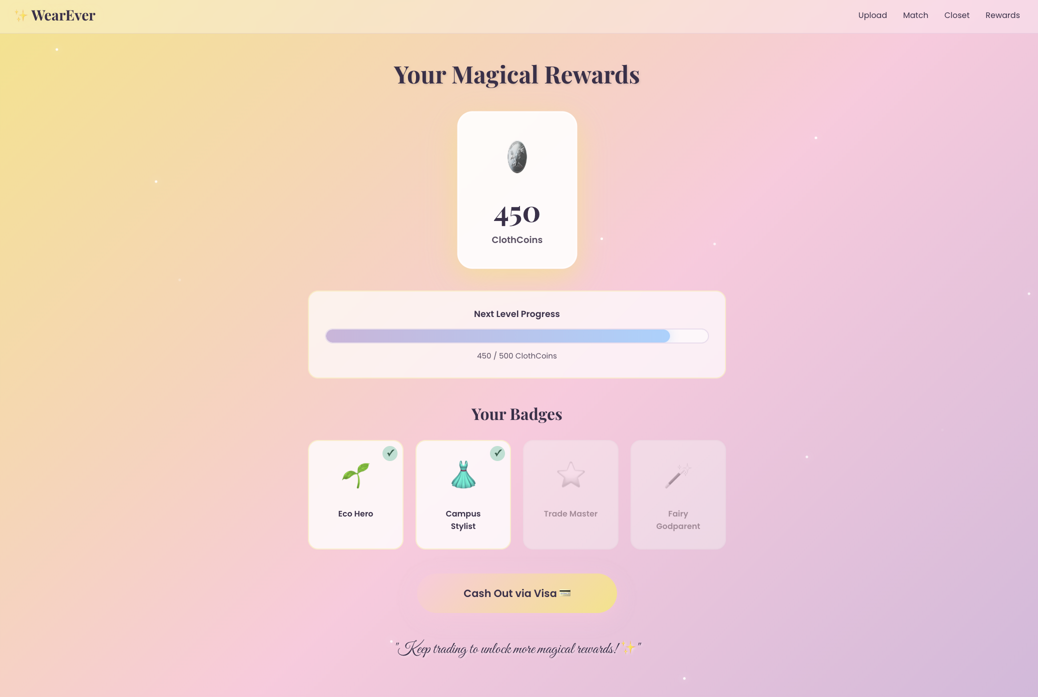 - Reward & Cashout System: Each successful trade earns ClothCoins, digital tokens representing sustainability and generosity. Users can also earn ClothCoins by watching short ads. Once they reach a threshold, they can cash out via Visa APIs into a virtual prepaid card or wallet (using Visa sandbox APIs).