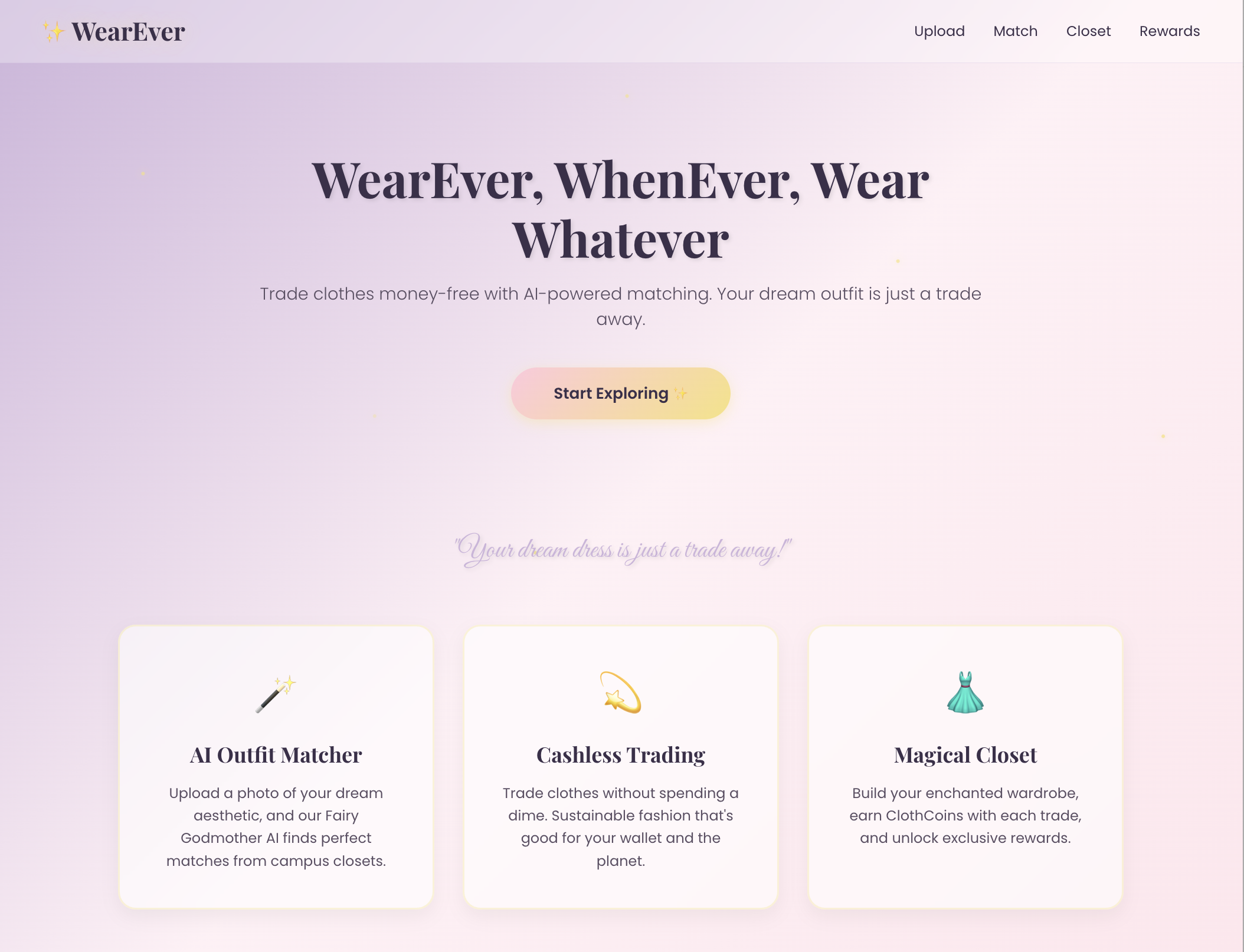 That story inspired us to create WearEver – a fairytale-themed clothing exchange platform that lets college students trade clothes for free. Users can find the pieces they need while passing on clothes they no longer wear, keeping fashion sustainable and accessible. Each account must use a verified .edu email, and all exchanges happen on campus for safety and convenience. By swapping instead of buying, students save money, reduce waste, and build community – turning closets into treasure chests of creativity.