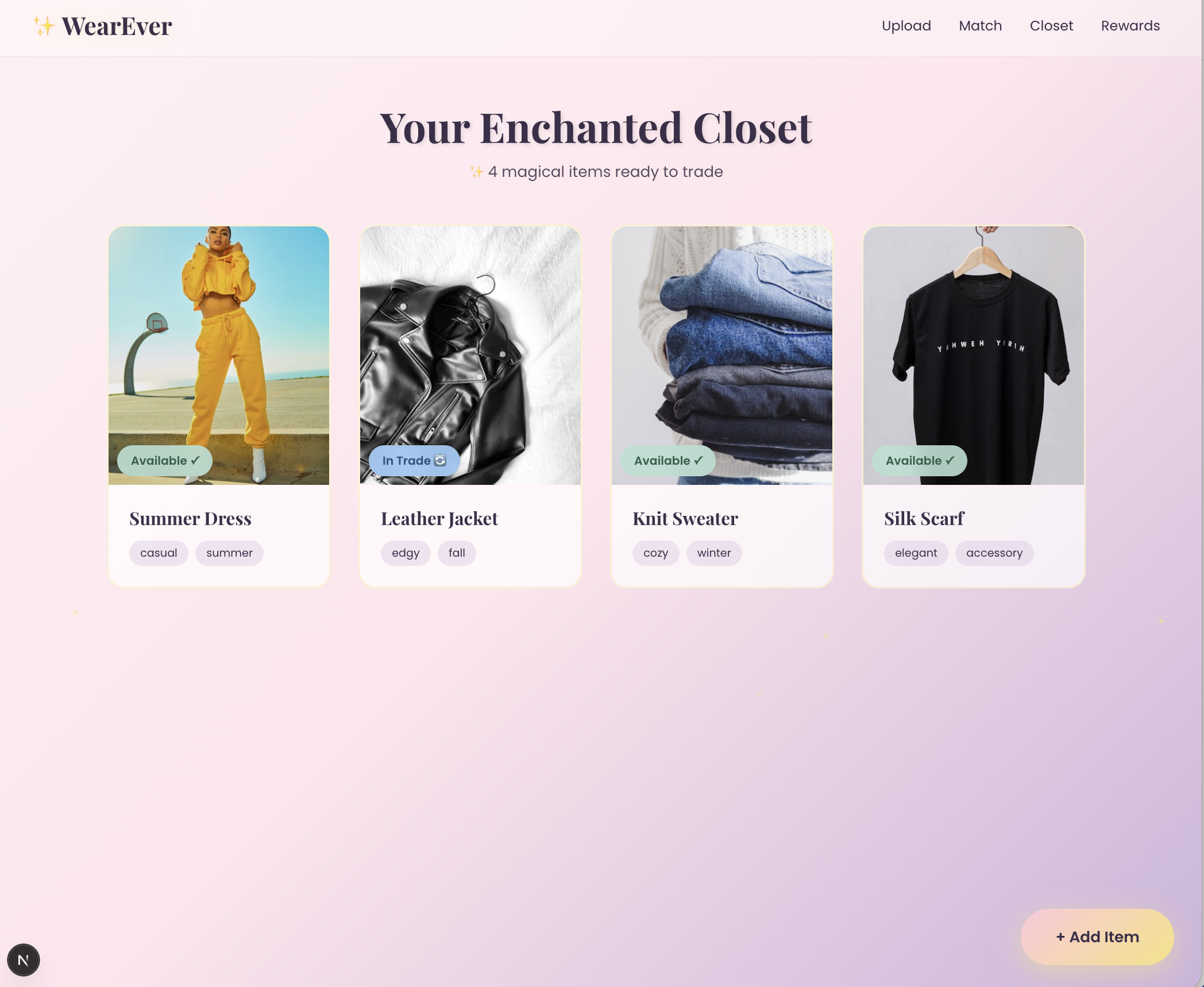 The platform brings a touch of magic to sustainability through features like a swipeable “closet carousel,” campus-safe meetups, and notifications for new likes, trade requests, or confirmed exchanges. Every trade feels like discovering a hidden gem in an enchanted wardrobe.