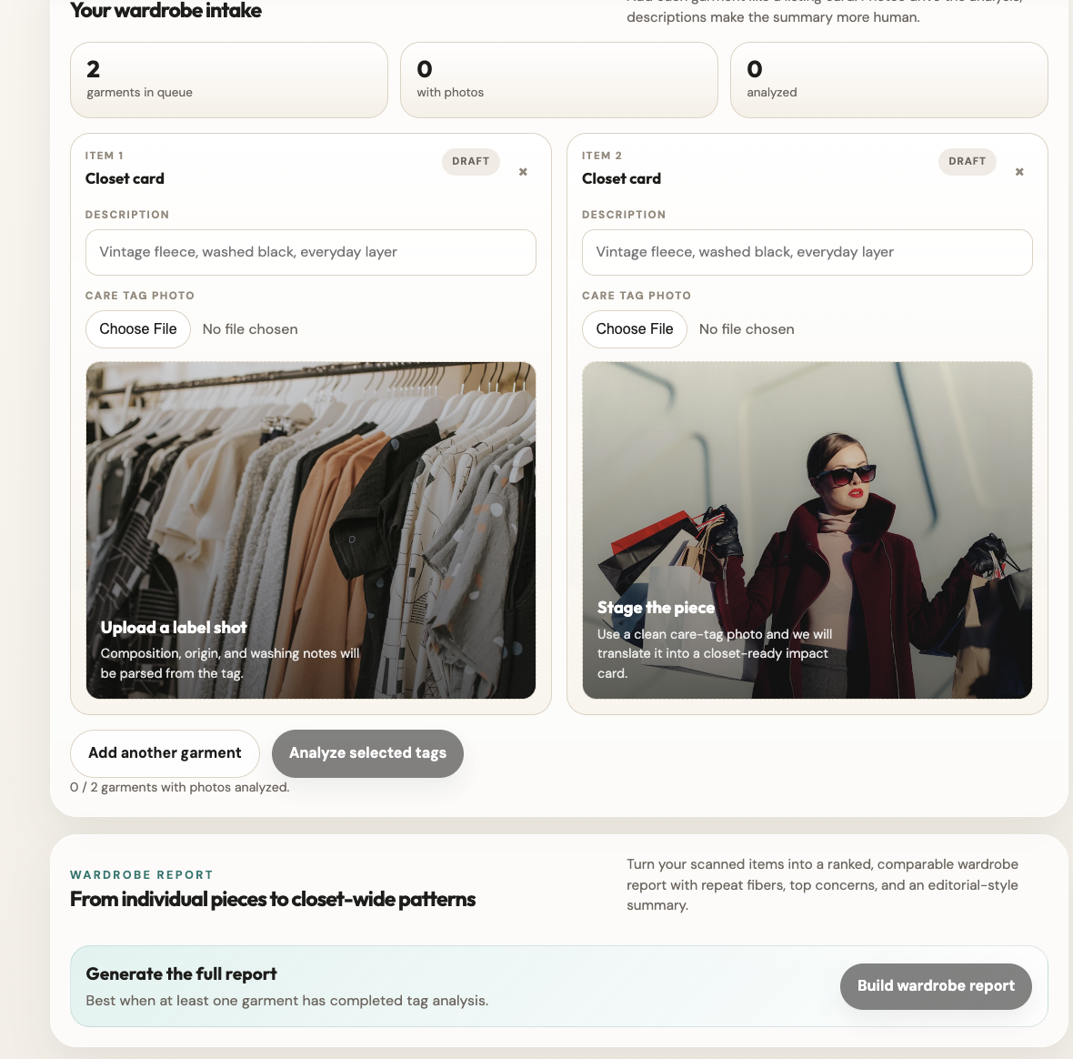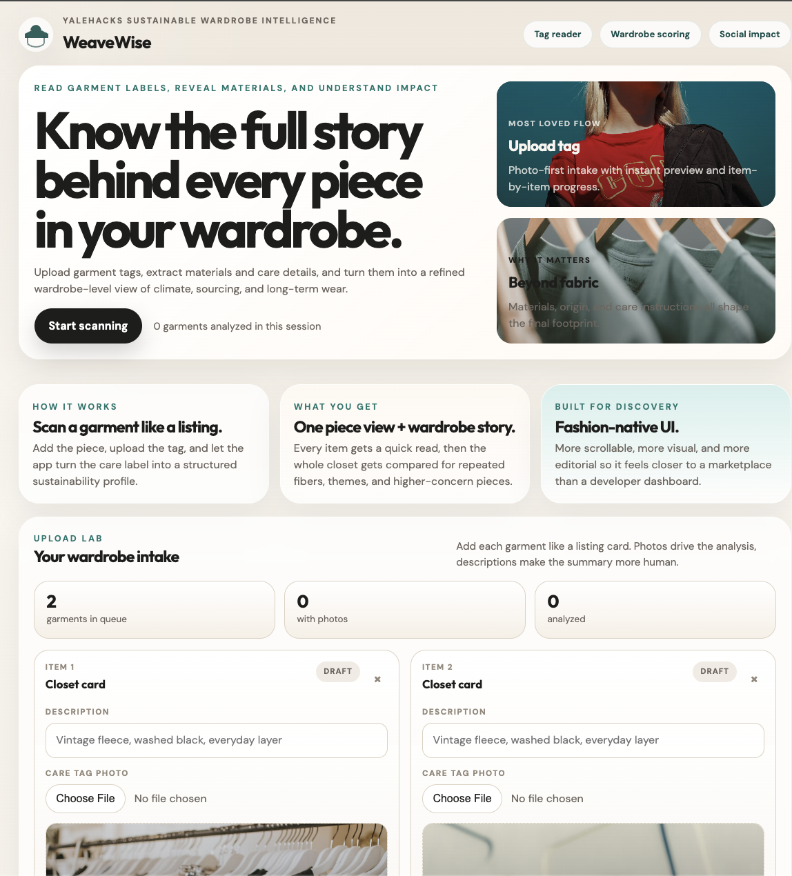 On the frontend, we created a more fashion-forward interface that feels closer to a polished consumer product than a prototype. Users can upload garment tag photos, preview pieces, and generate wardrobe-level summaries in a way that feels visual and approachable.