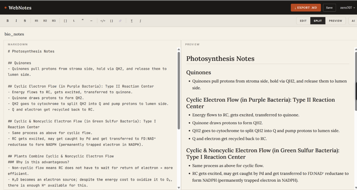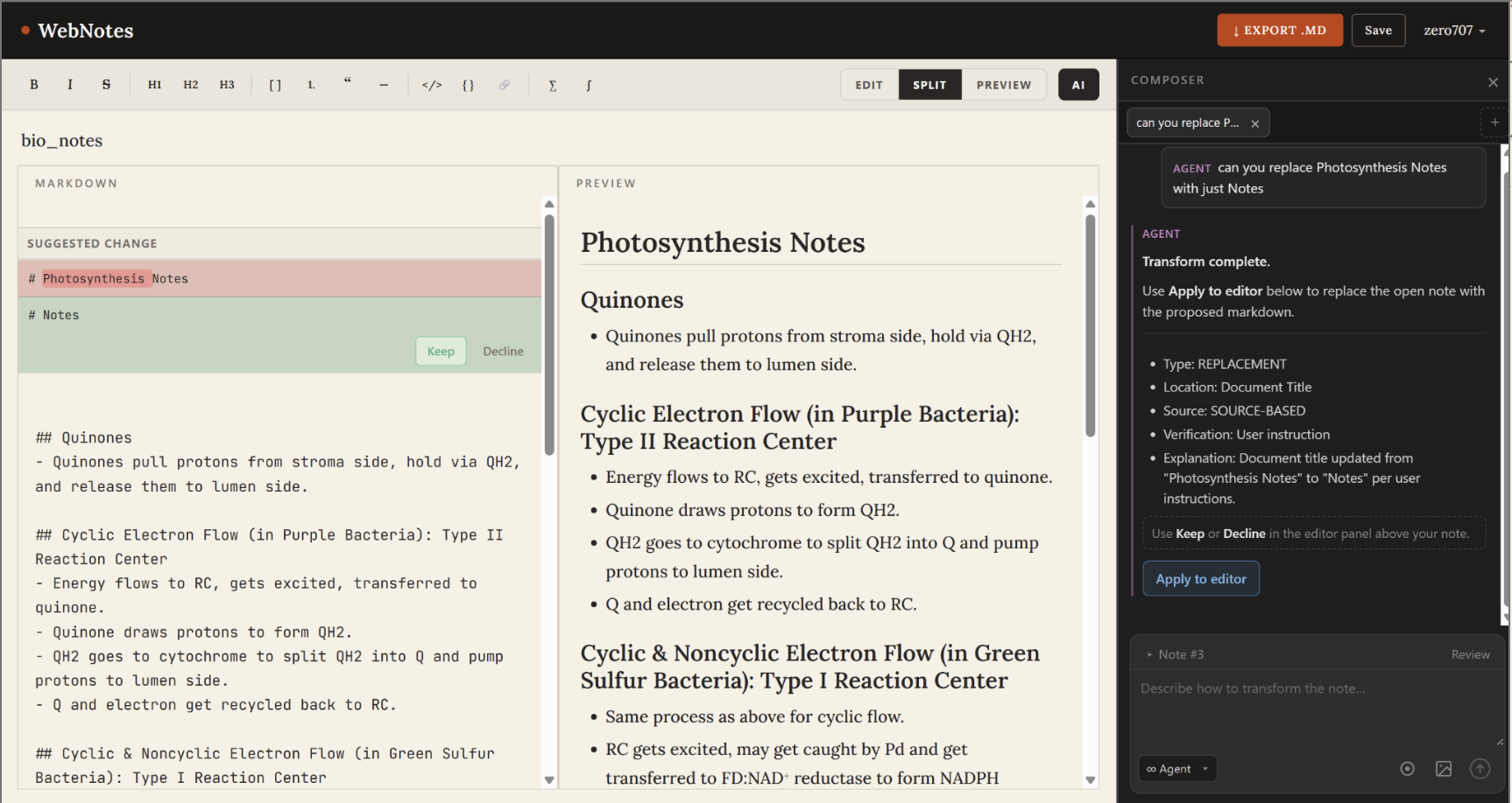 webnotes.study is an all-in-one note editor built for students. You upload typed notes, PDFs, or even handwritten pages which get converted to markdown automatically. Once your notes are in, you invoke the AI agent to review them. Every suggestion appears as a tracked change — you accept, modify, or decline each one individually. The AI never rewrites anything without your say.