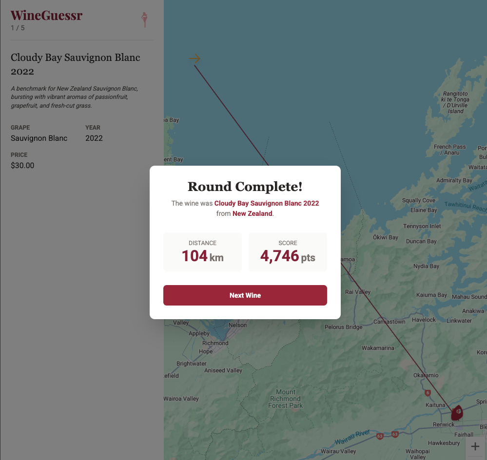 "Introducing WineGuessr – my solo project that's a game-changer, injecting unparalleled fun and competitive spirit into every wine tasting. Forget just guessing; immerse yourself! Imagine this: you're presented with a tantalizing wine description, and your mission is to pinpoint its origin on a global map, just like the thrilling challenges of GeoGuessr. The closer you are to the actual vineyard, the more points you score! Did you correctly deduce that bold Cabernet Sauvignon hails from the sun-drenched vineyards of Bordeaux and not the rolling hills of Burgundy? Earn those bonus points and bragging rights! This isn't just tasting; it's discovery, a test of my palate, and a global exploration – all in one exhilarating experience!"