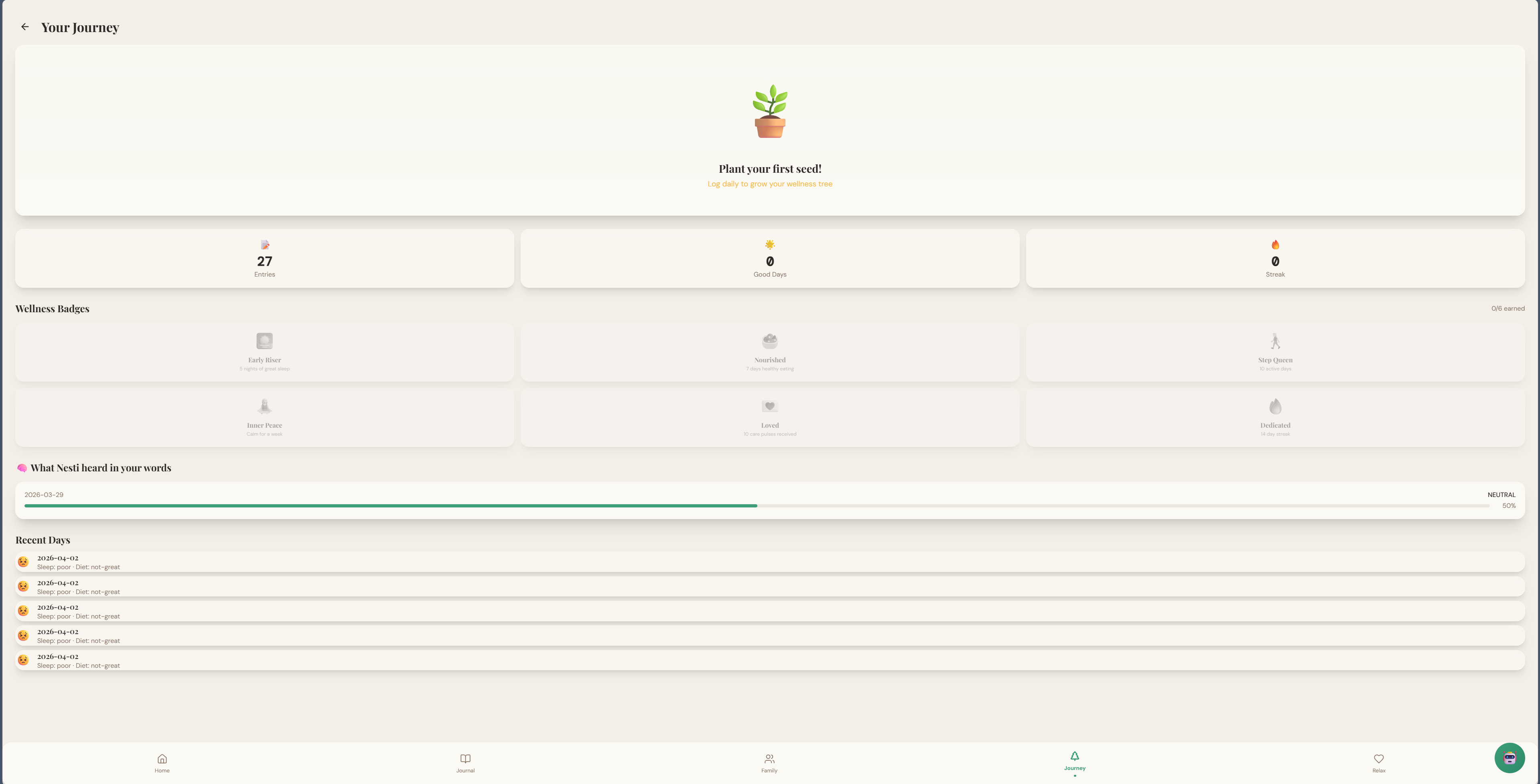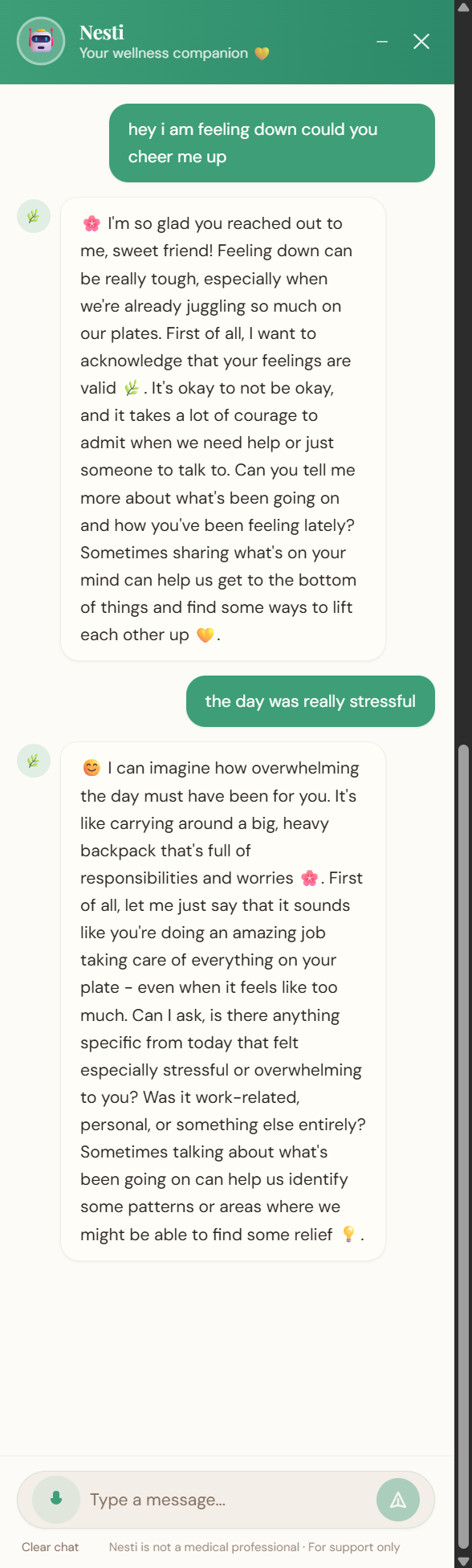Conversational daily check-ins Mood and habit tracking Emotion-aware feedback from Nesti (the in-app companion) Wellness reports with trend charts and downloadable PDF summaries Sanctuary and journaling spaces for reflection For families, it provides: