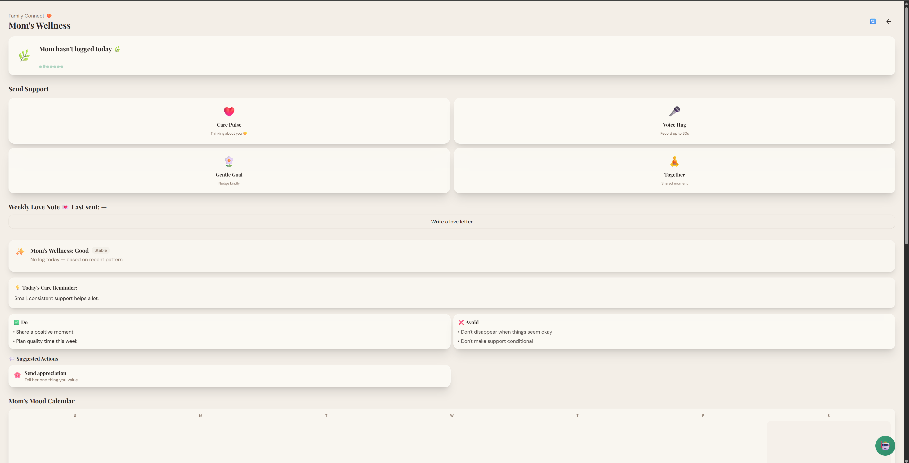 Family dashboard visibility based on privacy settings Care Pulse messaging to send gentle encouragement Love Archive to preserve supportive messages Risk-aware alerts when support may be needed AI capabilities include: