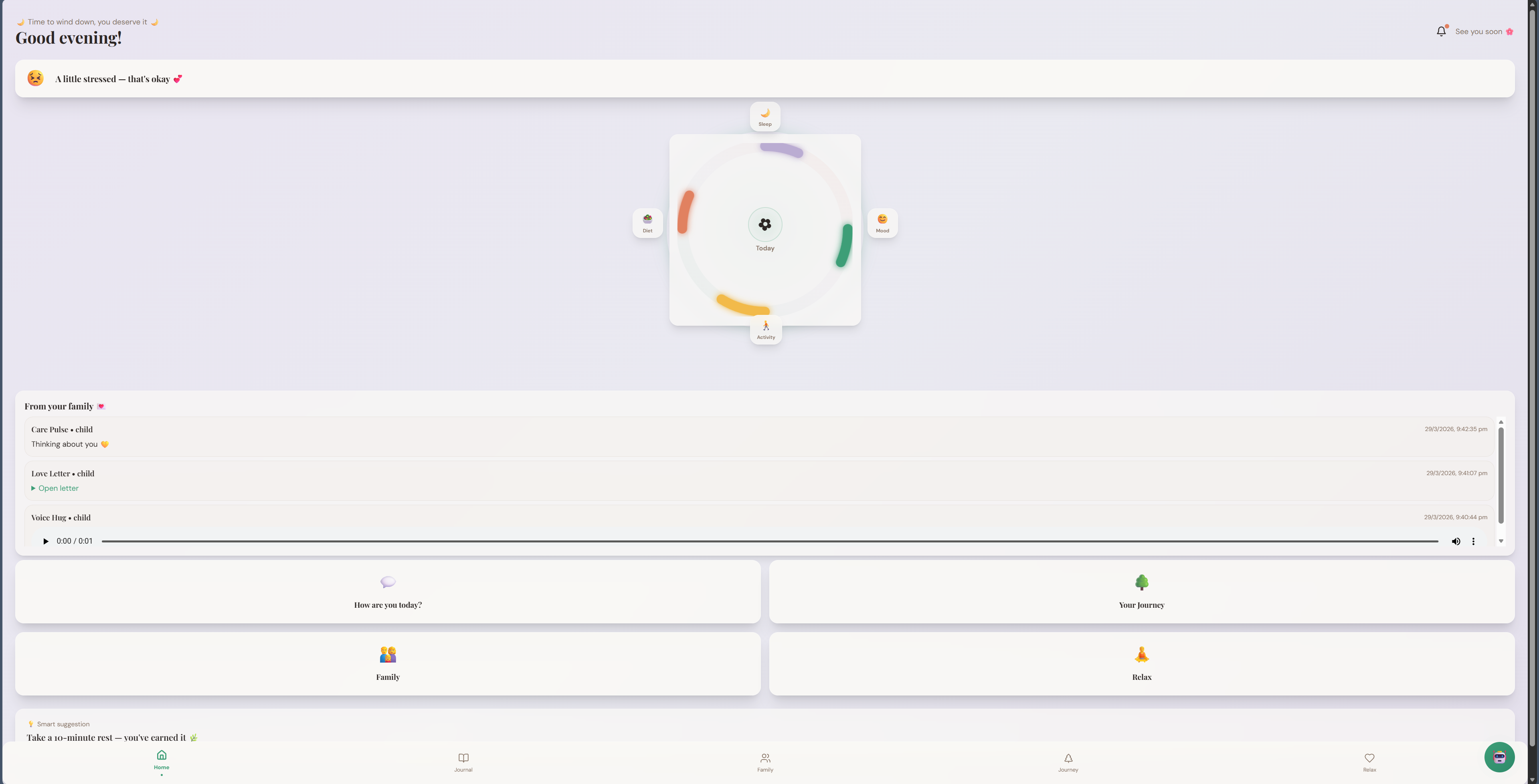 End-to-end working platform with role-based user journeys Explainable AI insights integrated directly into daily wellness flows Human-centered features like Care Pulse, Love Archive, and privacy levels Reporting experience with trend visualizations and exportable PDF summaries A cohesive product that combines emotional design with production-style architecture