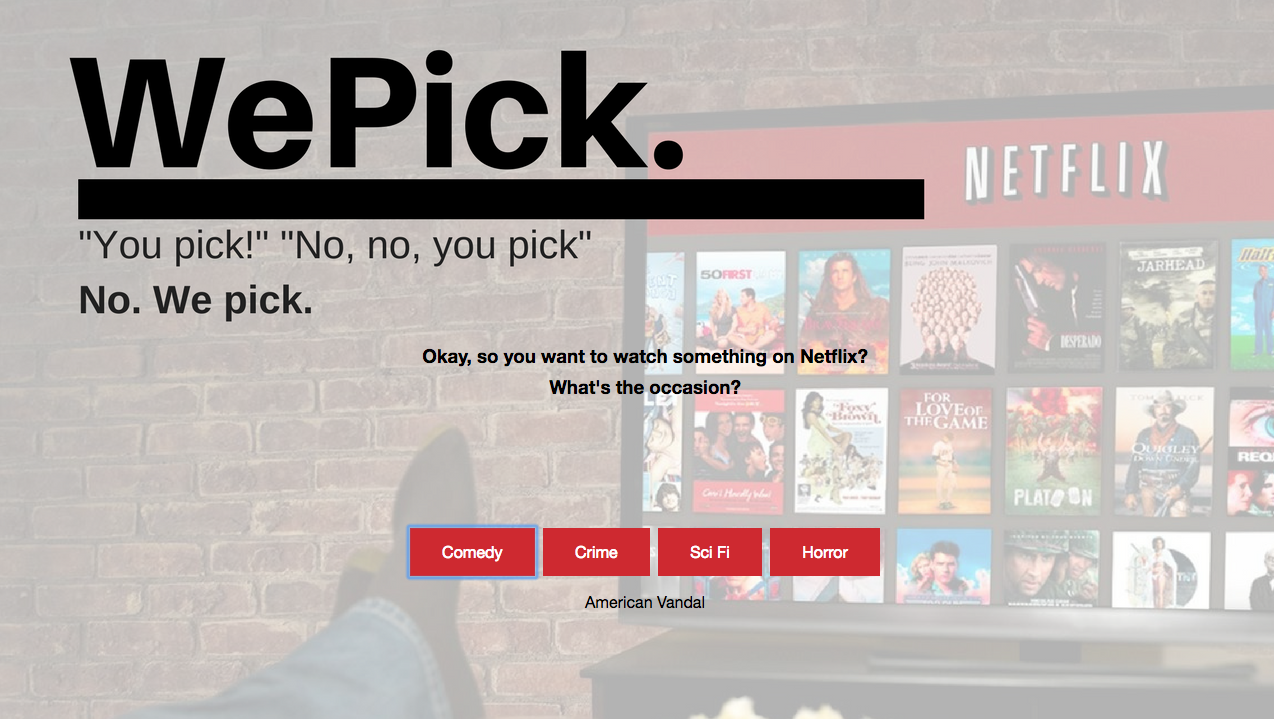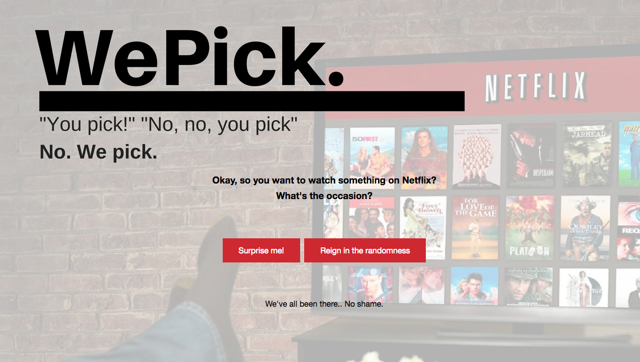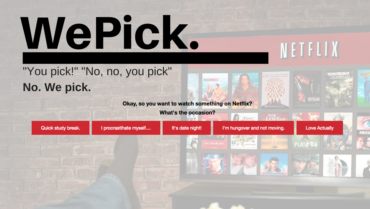WePick will randomly select something for you to watch on Netflix based on categories of how much time you're looking to spend.