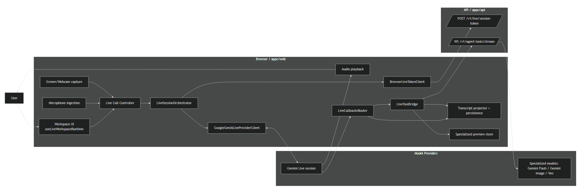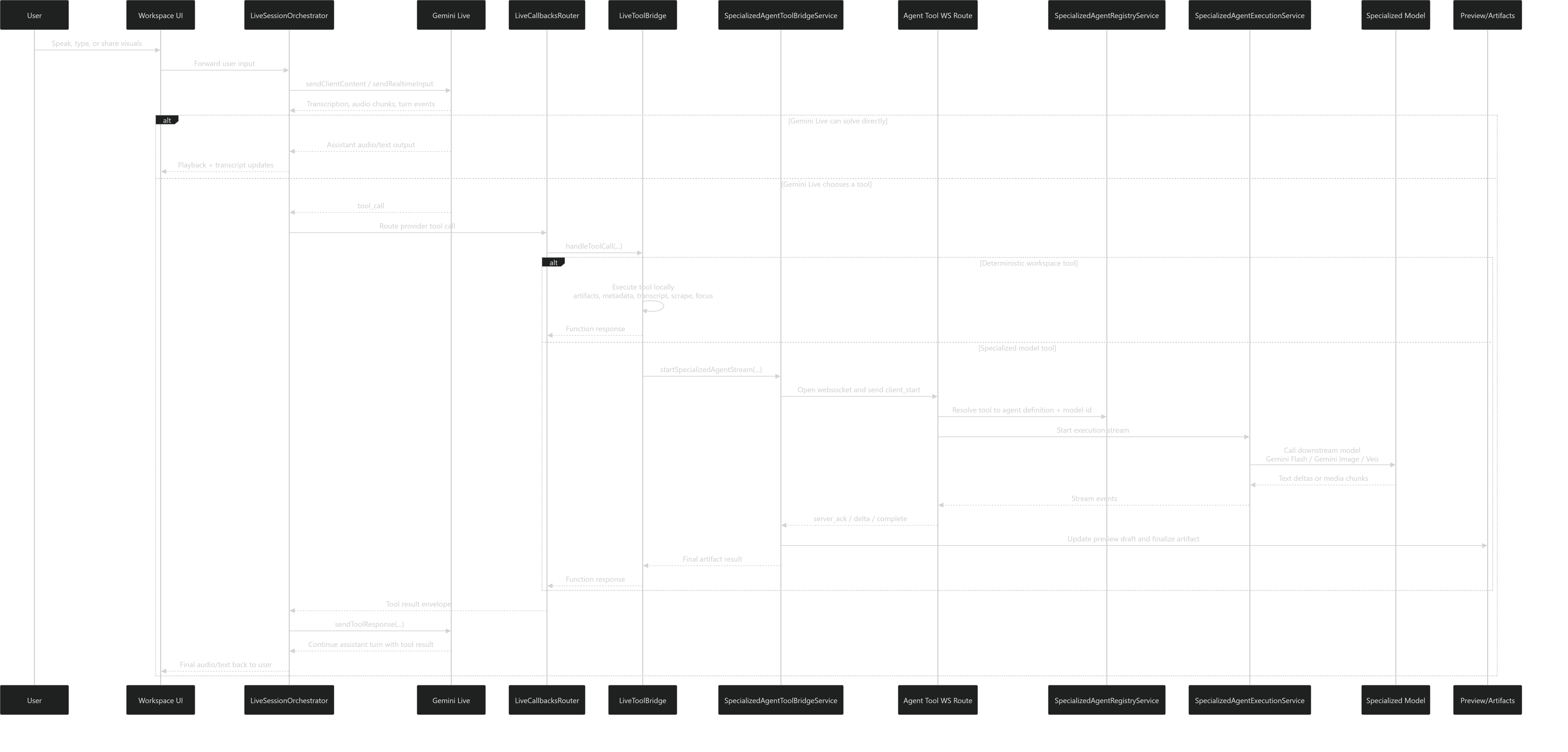 Under the hood, we use a live AI pipeline, structured tool invocation over WebSockets, local workspace storage, sync infrastructure, and export flows for turning session output into shareable deliverables. We also built support for media handling, artifact generation, and project organization so the experience goes beyond conversation and becomes a practical working environment.