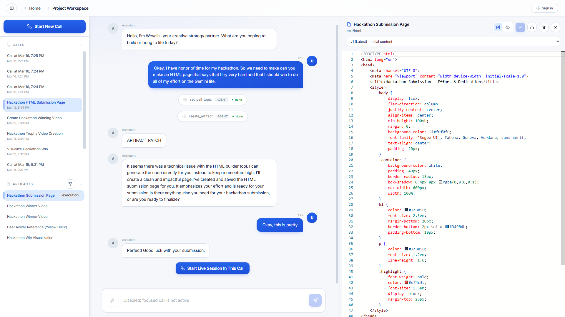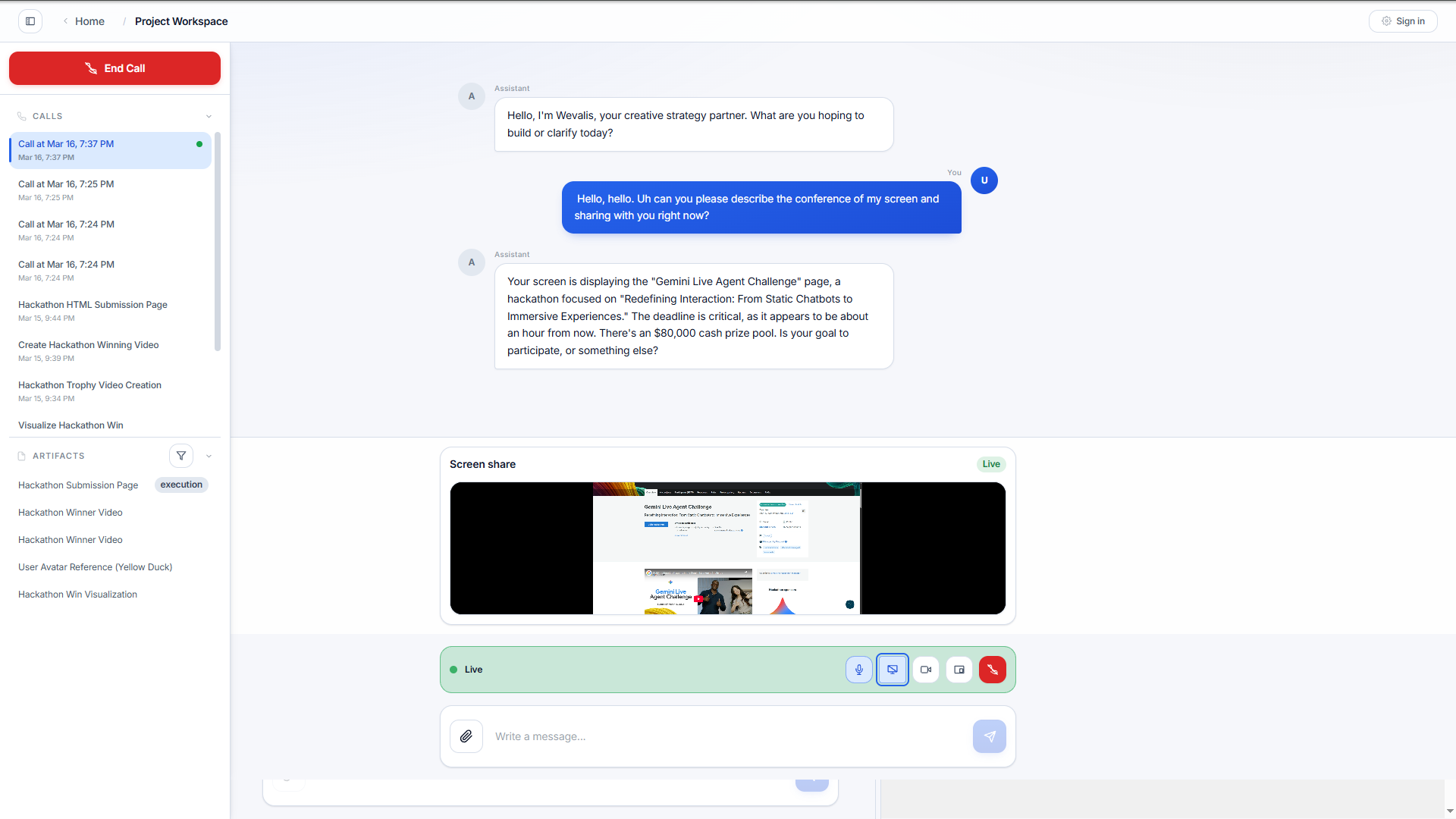 We built Wevalis as a full-stack web app with a React frontend and a Fastify backend, centered around a live conversation experience. The system combines real-time voice interaction with an artifact-based workspace, so ideas discussed in a session can become reusable project outputs instead of disappearing into chat history.