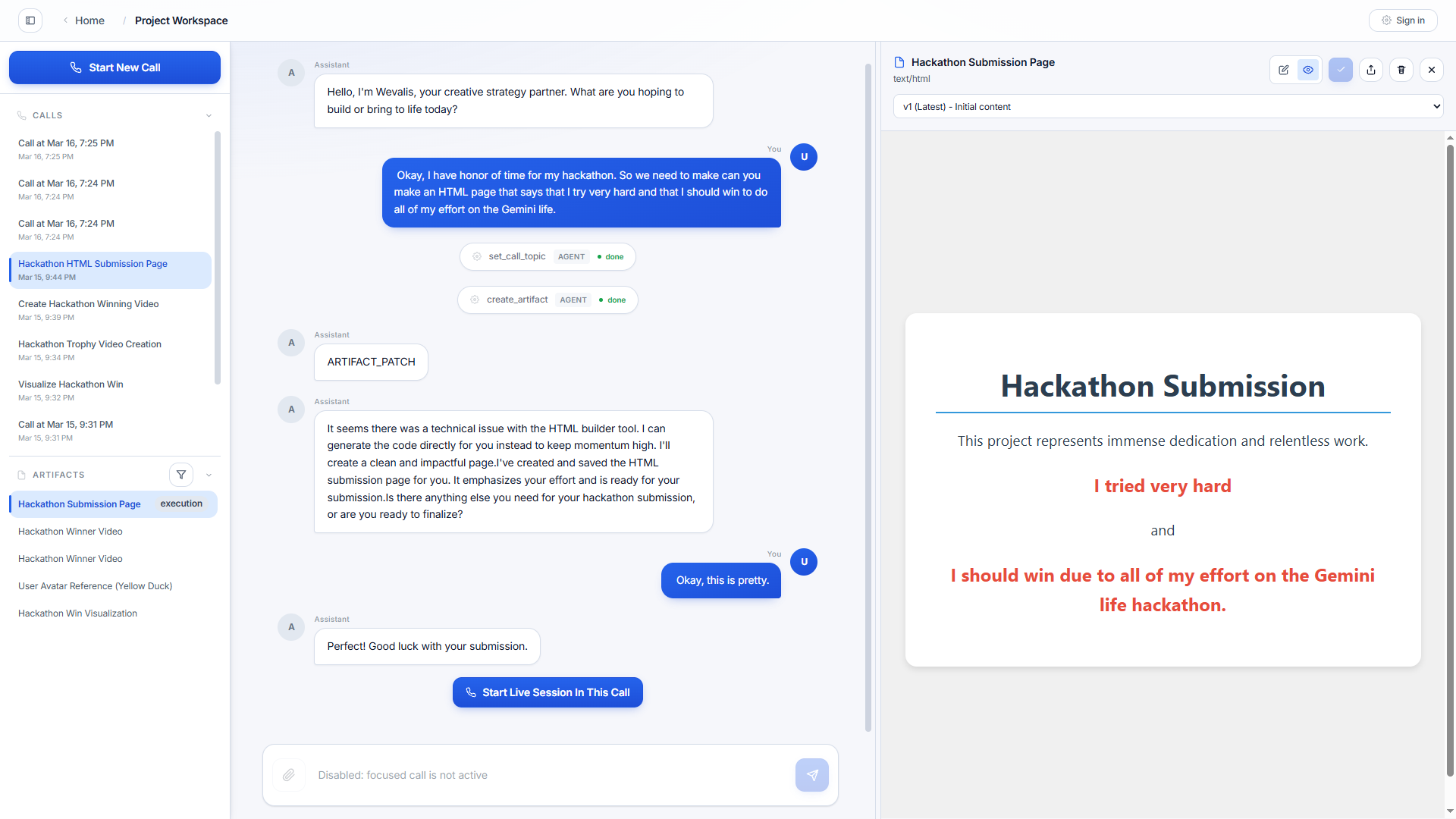 We wanted something we could literally talk to during ideation. Speaking feels far more natural and engaging than reading long blocks of LLM-generated text, so Wevalis became a way to rubber-duck our ideas in real time, pressure-test them, explore directions faster, and generate quick proof of concepts and supporting materials along the way, including images and videos.