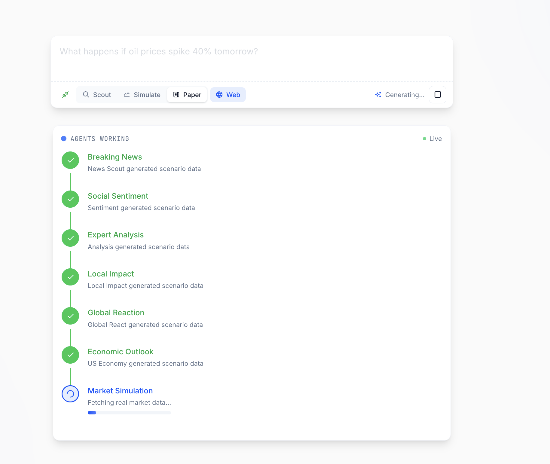 Simulate real world events (ask anything, get news simulation, market simulation, stock price simulations)