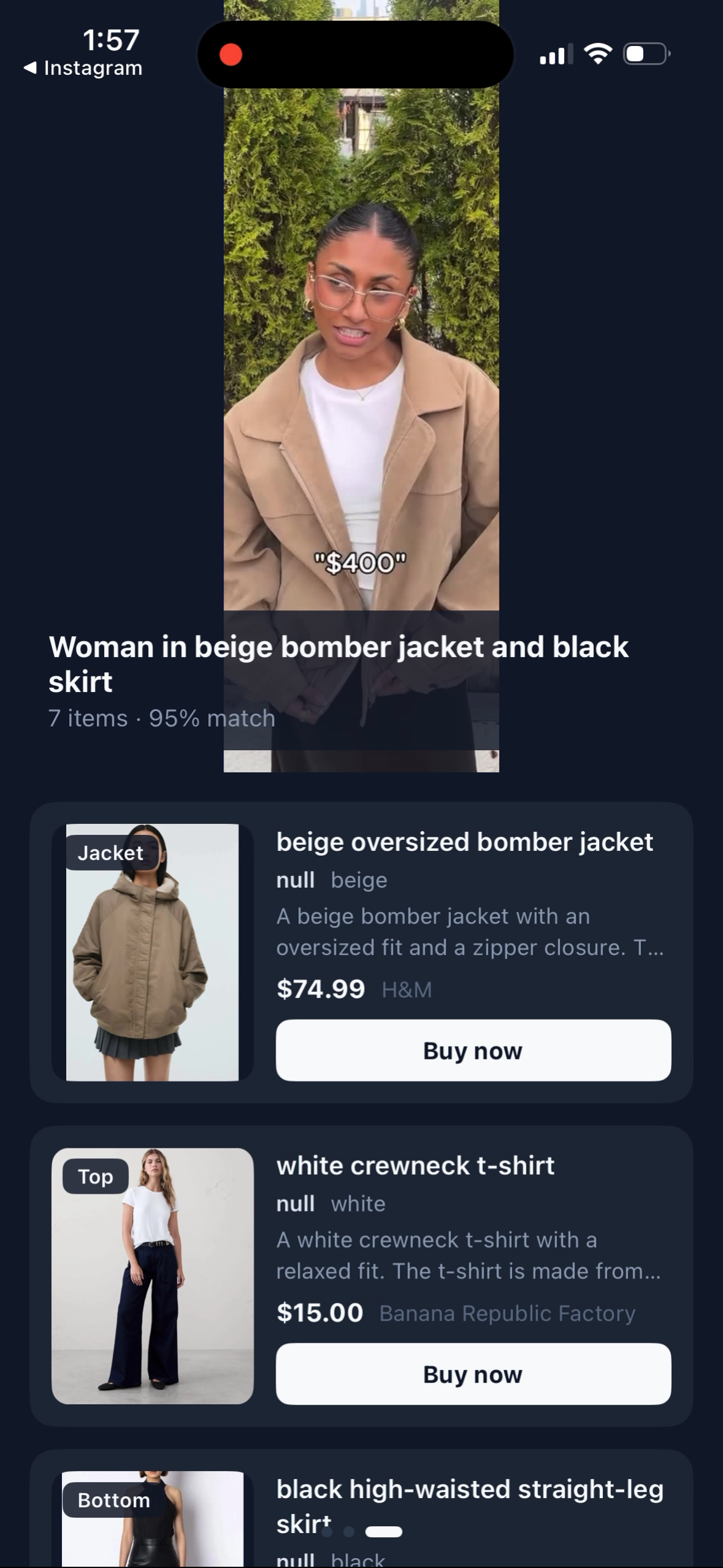 You're scrolling Instagram or TikTok, you spot an outfit someone's wearing, and you think "I need that jacket." Then you spend twenty minutes reverse-image-searching, reading comments, and giving up. Every piece of good content on social media doubles as an accidental ad for clothes nobody can actually buy. I wanted to close that loop.