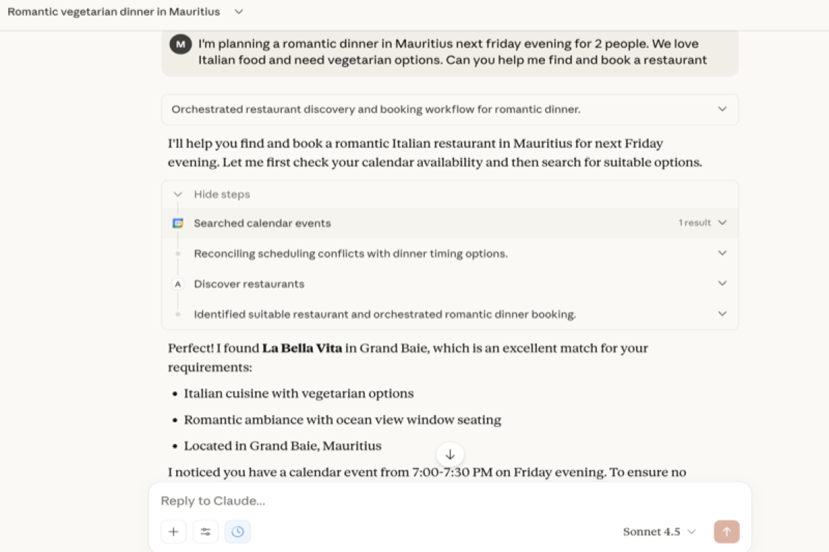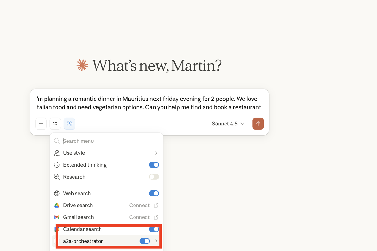 demo a2a 2: Claude Uses Tools - Calendar Check & Restaurant Discovery
