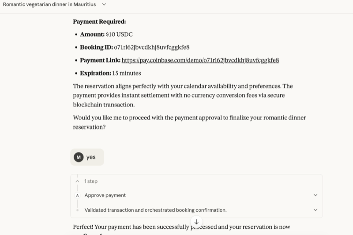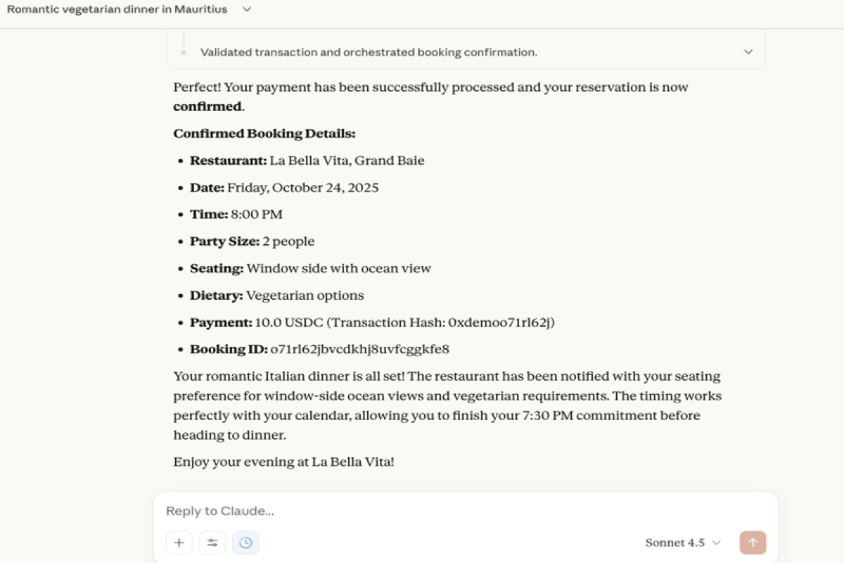 demo a2a 3: Claude Finds 8 PM Slot & Requests Deposit of 10 USDC via AP2 x402, Human-in-the-Loop - Payment Approval