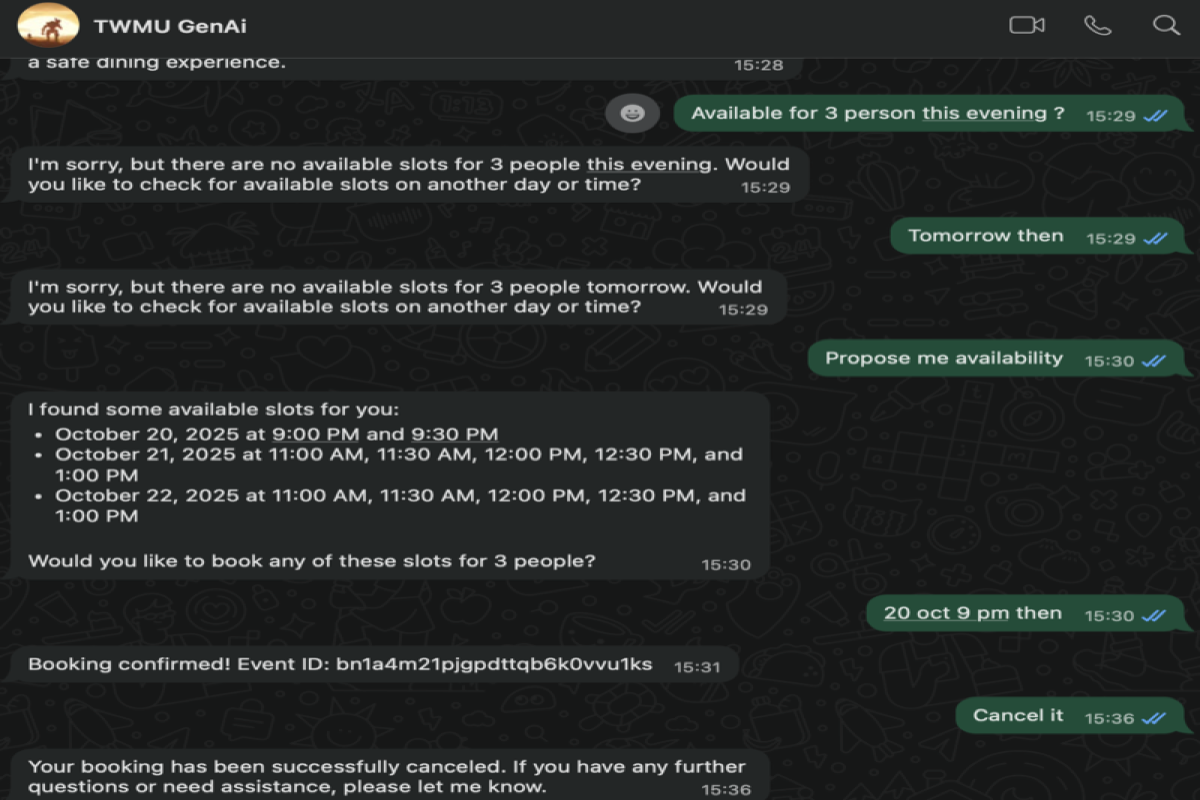demo whatsapp 2: Customer books a table for 3 people. Agent checks Calendar availability, creates the appointment, later customer cancels .
