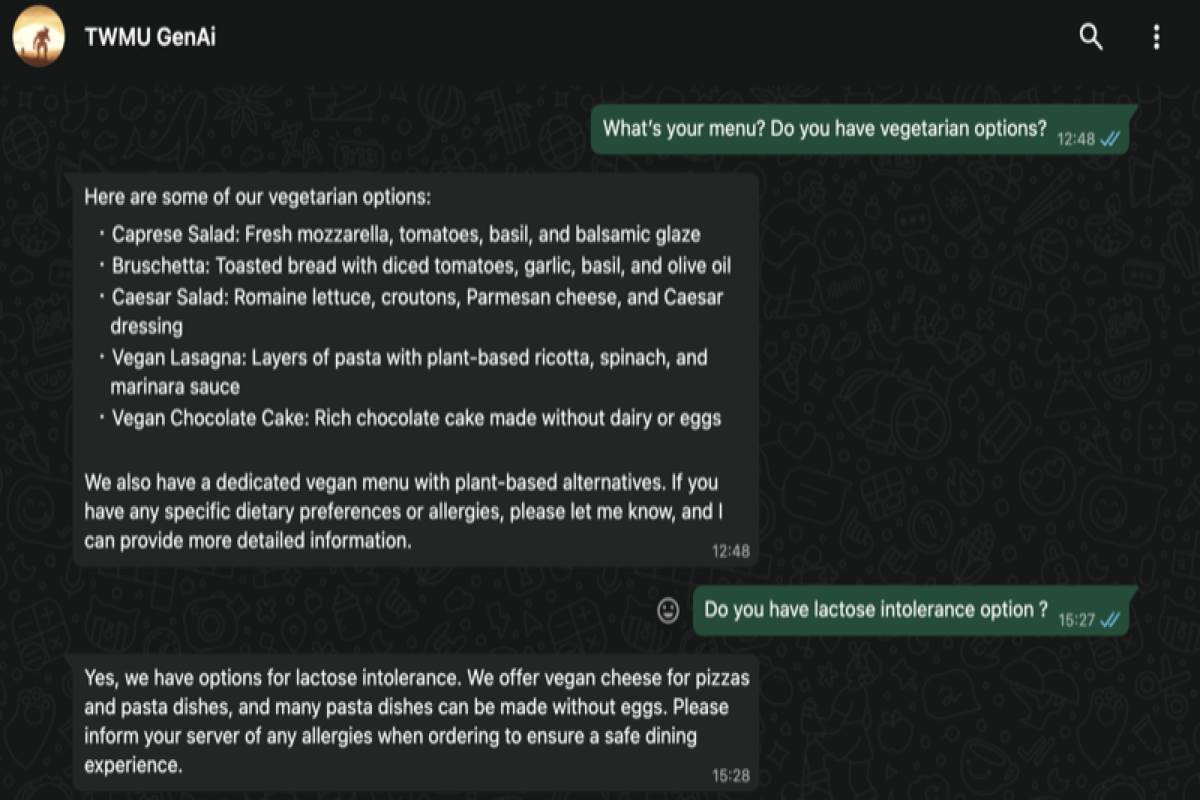 demo whatsapp 1: Customer asks about vegetarian options and lactose intolerance. Agent instantly provides information from the knowledgebase