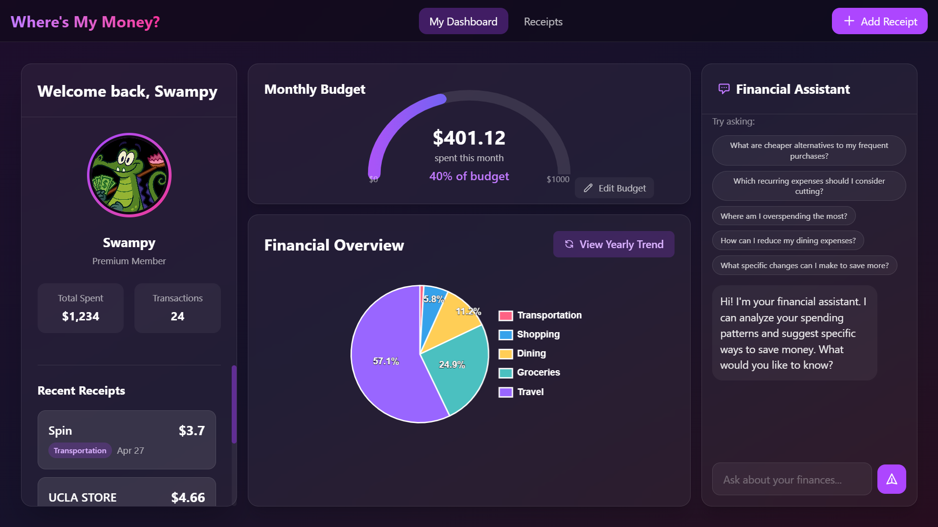 As broke college students with 2-digit checking account balances, we realized we needed to uncover the root cause of our financial struggles. Where’s My Money is the solution to track, analyze, and optimize our spending, so we can regain control of our finances.