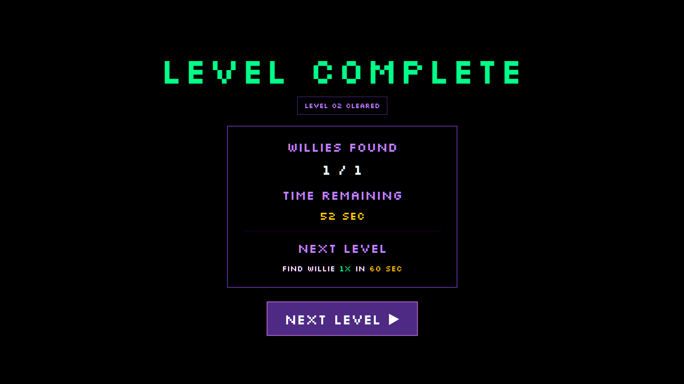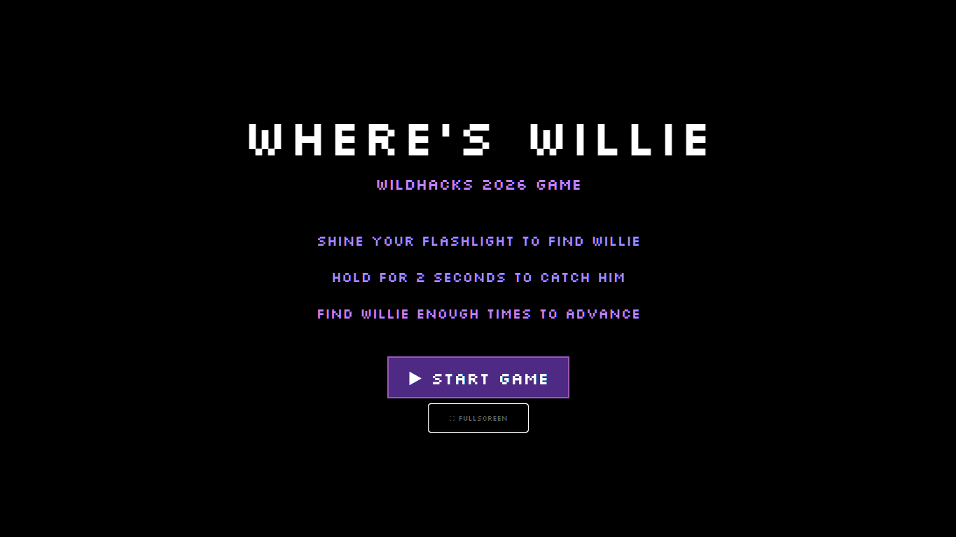 Where's Willie is a digital Where's Waldo inspired game built for the WildHacks 2026 childhood games theme. A flashlight spotlight controlled by mouse or physical hardware reveals a hidden character named Willie against a dark canvas. Find Willie enough times before the timer runs out to advance to the next level. The software is fully built to support physical hardware integration. A physical flashlight tracked by an IMU sensor streams coordinates over USB serial to control the spotlight in real time.