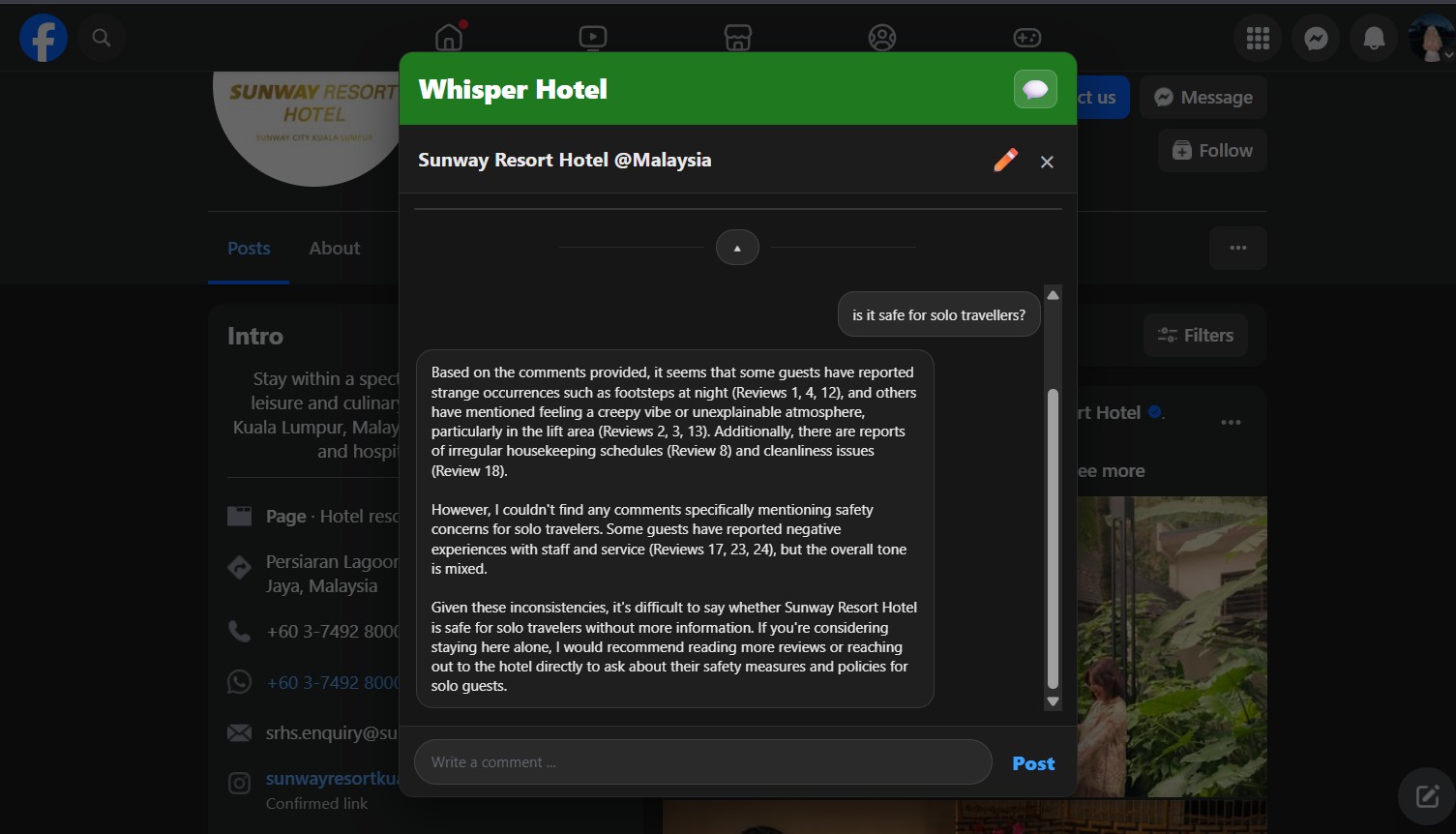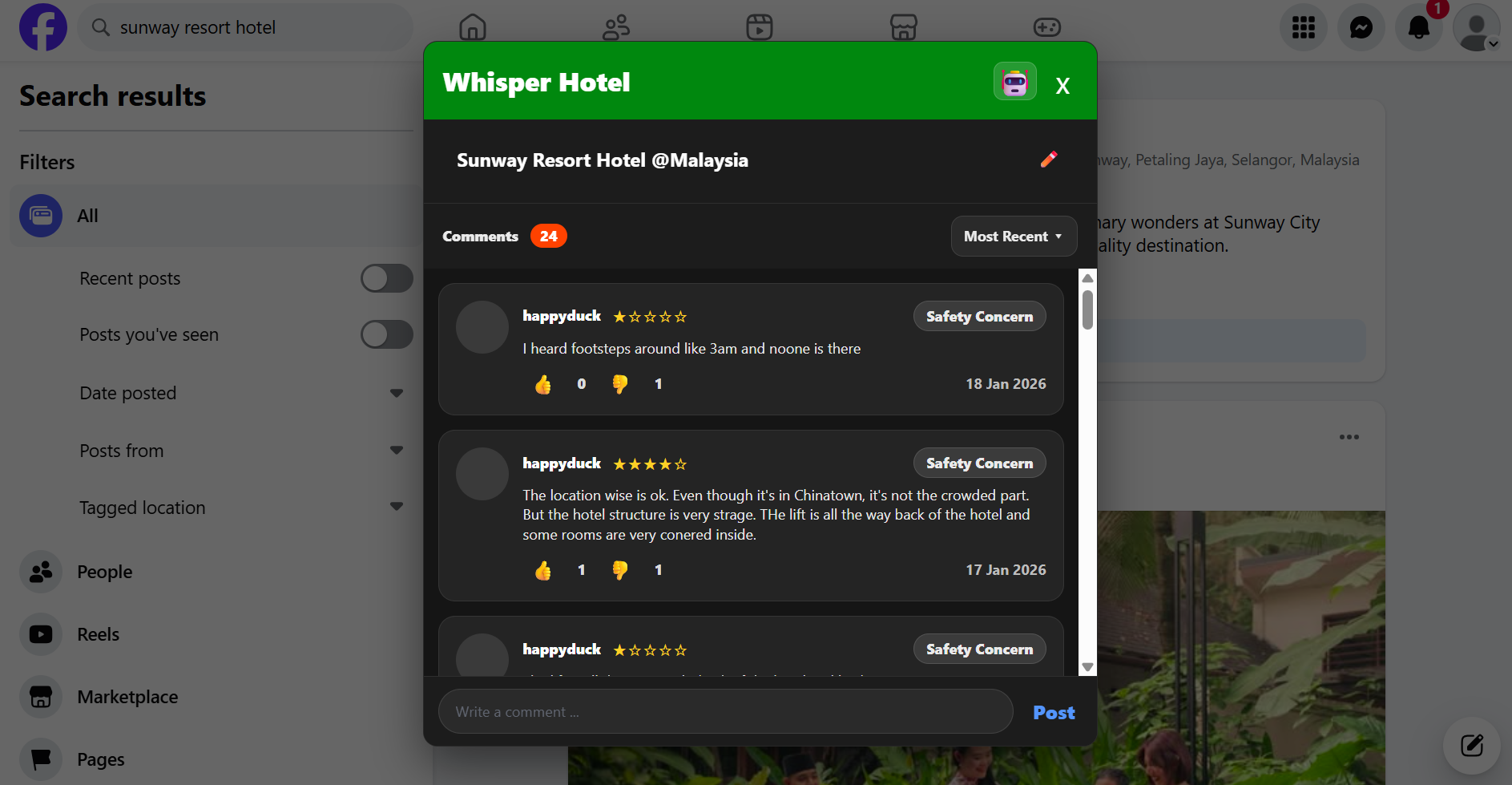 ⭐ Inspiration Hotels often look perfect on official booking sites—but the safety, vibes, and real guest experiences are hidden deep inside scattered comments on Facebook, TikTok, Reddit, YouTube, and travel blogs. We wanted a tool that summarises the “real feelings” of a hotel, especially safety and creepiness, without users needing to search across multiple platforms.