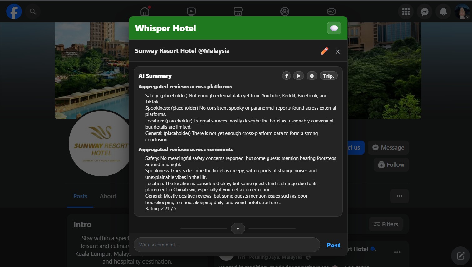 ⭐ What's next for Whisper Hotel These are the features we want to add after Hack&Roll: Multi-platform scraping (TripAdvisor, Agoda, Booking.com) AI-generated hotel “creepiness score” Visual heatmaps (safety vs spookiness vs comfort) More categories (Noise, Cleanliness, Staff, Privacy) Mobile version (Chrome Android + standalone app) Browser automation to monitor hotel mentions across the web Public profile system for reviewers Combined analysis from external social platforms