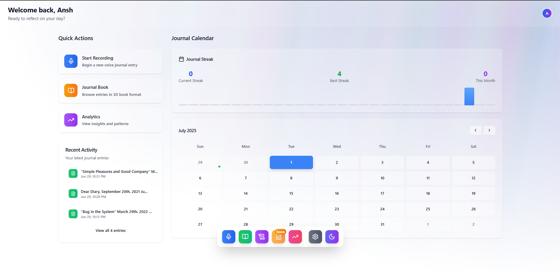 It then transforms your voice logs into emotionally intelligent, beautifully written journal entries.