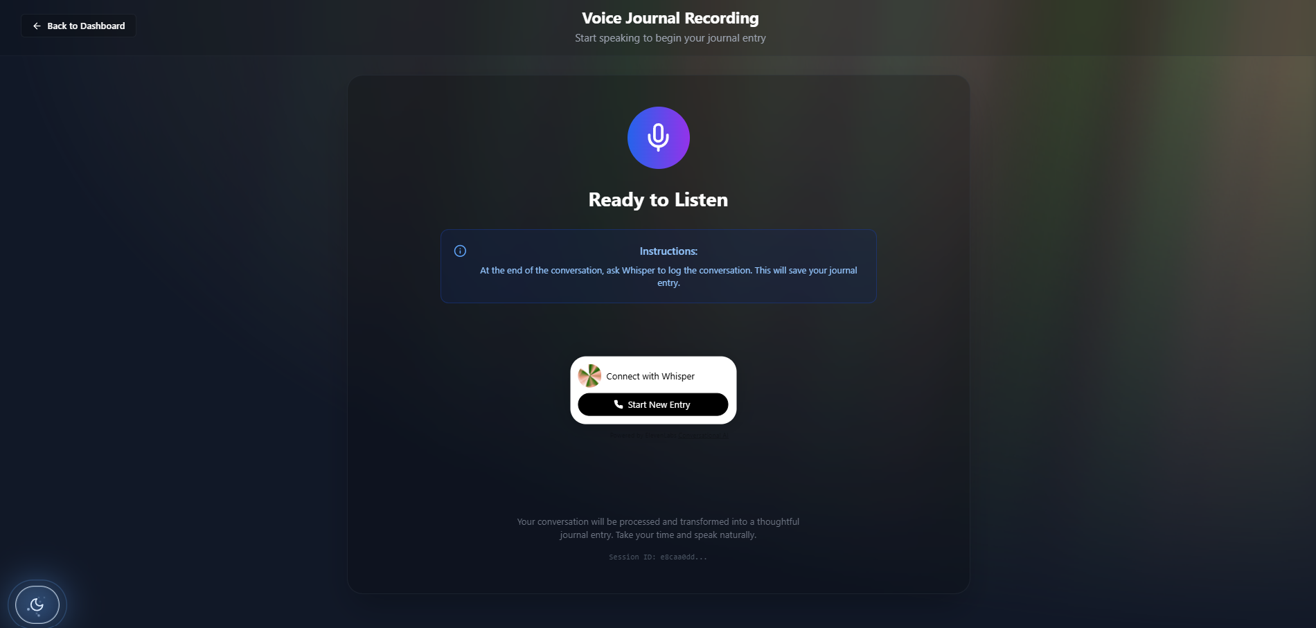 Whisper is a voice-powered journaling companion. Just speak your thoughts—Whisper listens, understands, and gently encourages you to talk more about your day, your feelings, and your experiences. It responds like a thoughtful friend, asking reflective questions and helping you go deeper.