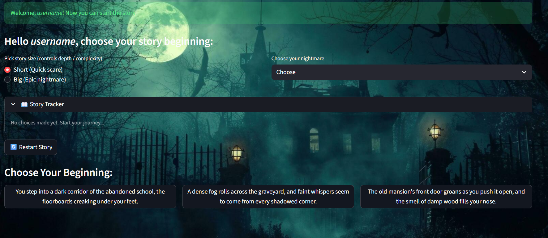 Register with a username & password Choose story size and horror theme (Ghosts, Vampires, Zombies, Demonic Possession) Make branching choices that dynamically change the narrative Unlock a password-protected ending and download their personalized horror story