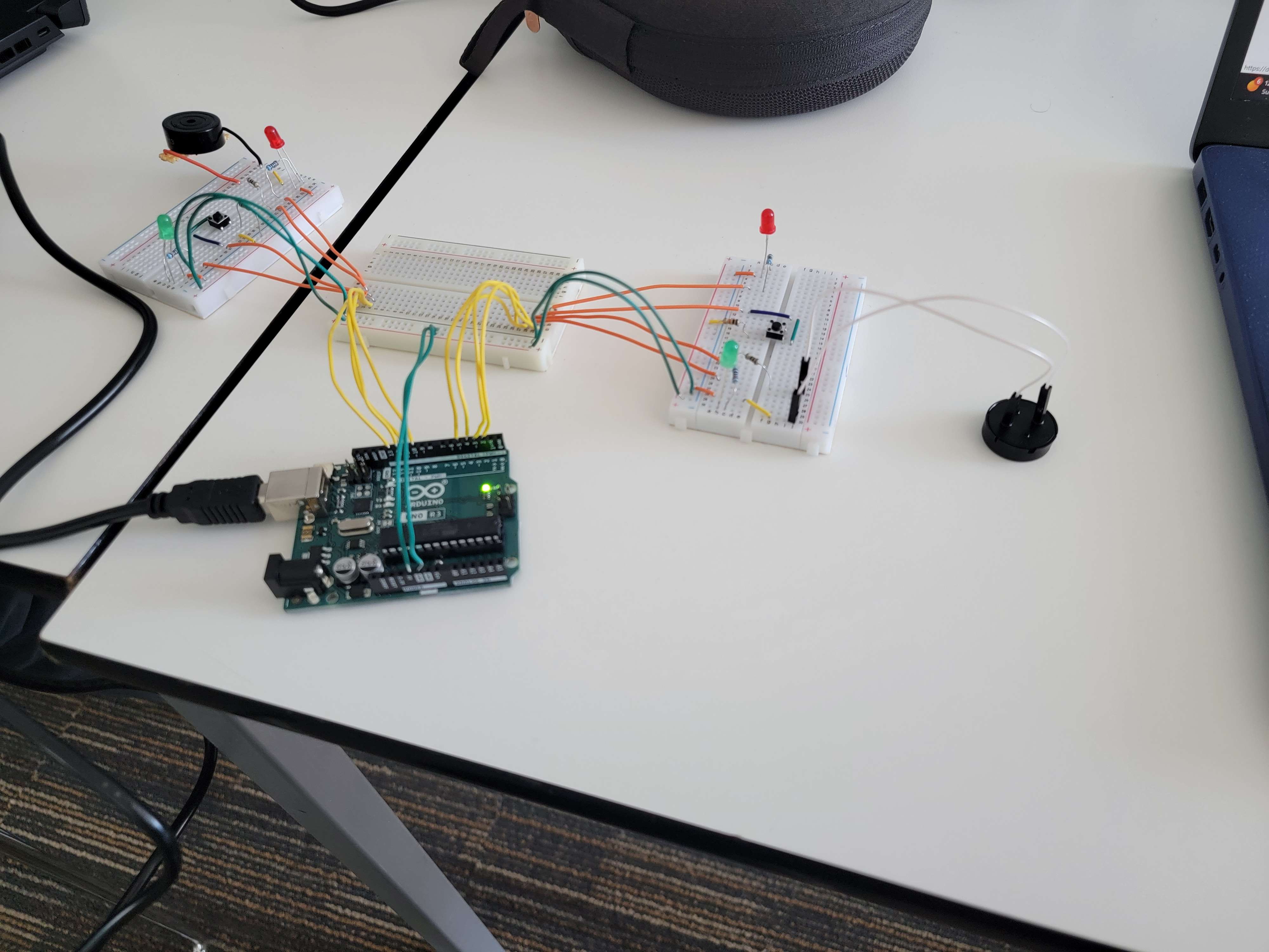 Arduino interface: The Arduino connects to 2 boards, one for each player, with each board equipped with a button, a buzzer and LEDs to feedback to the user. The Arduino communicates directly with the main webapp to tell it which player buzzed in, then it receives back data on whether that player got the answer right or wrong, at which point the Arduino will play an appropriate fanfare.