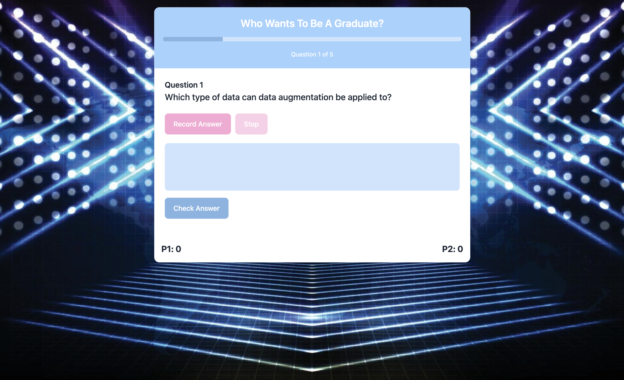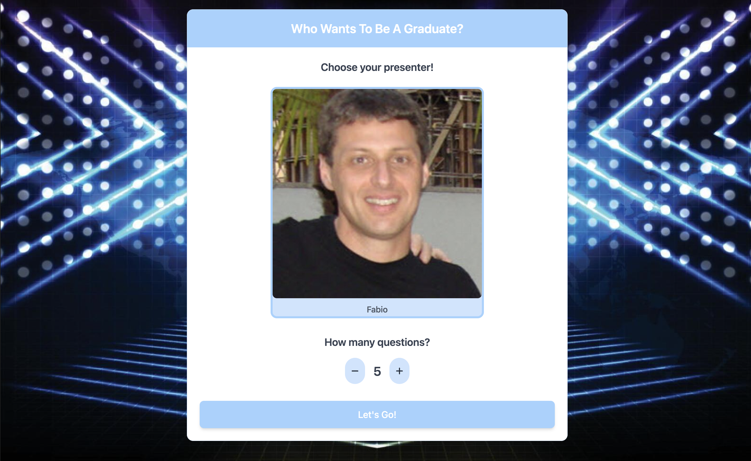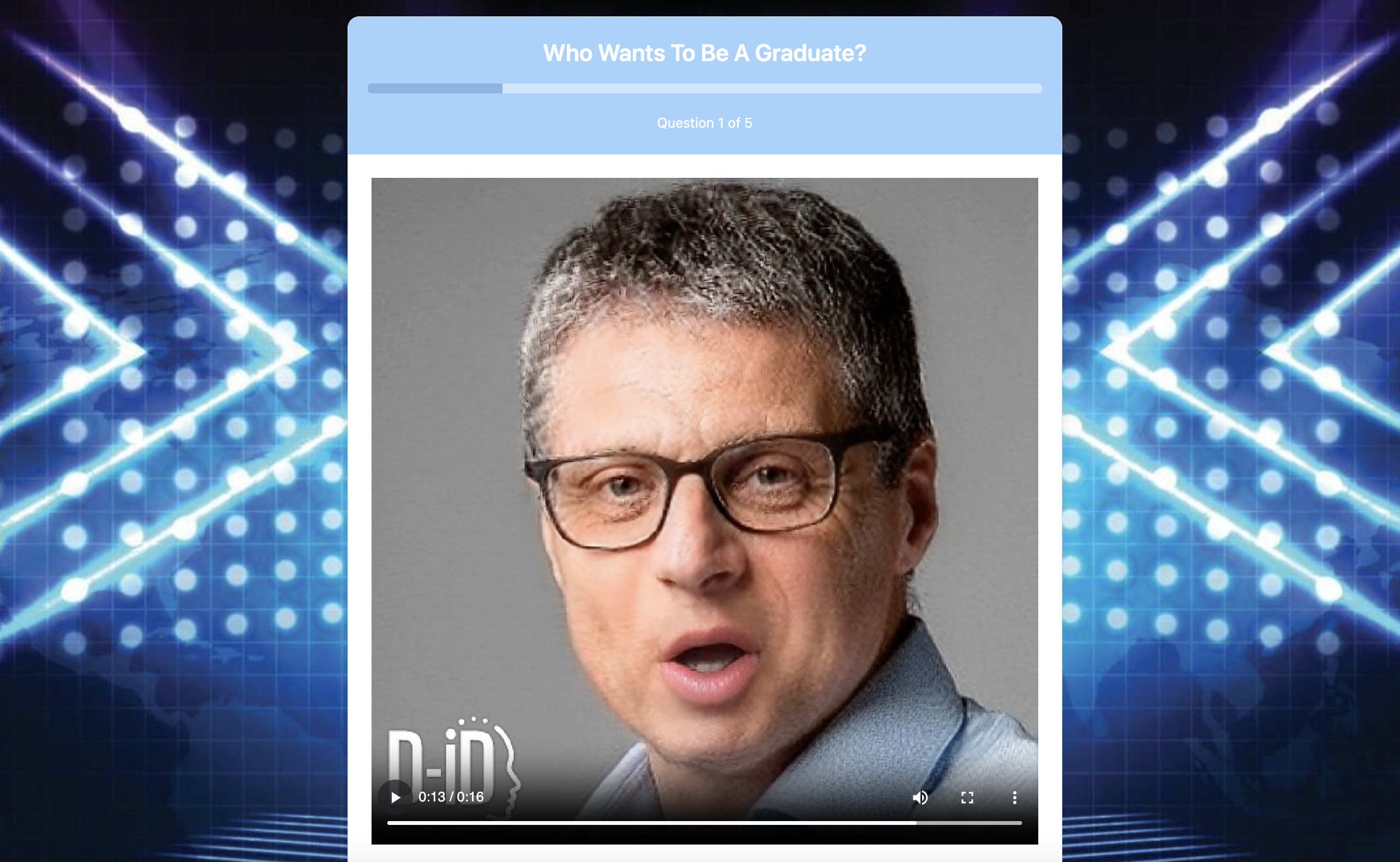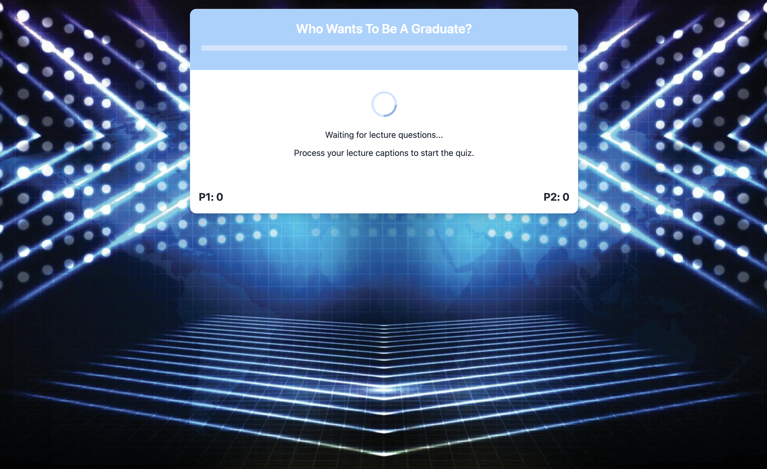While on a Panopto recording of a lecture, access the chrome extension to gather the information of the lecture and generate a quiz of with a chosen number of questions. Two players will then compete to buzz in first and answer each question verbally correctly to gain a point. A flagship feature is the AI game show announcer, taking the form of our very own Fabio Nemetz. This elevates the game from a simple quiz to a show fit for audiences at the univeristy!