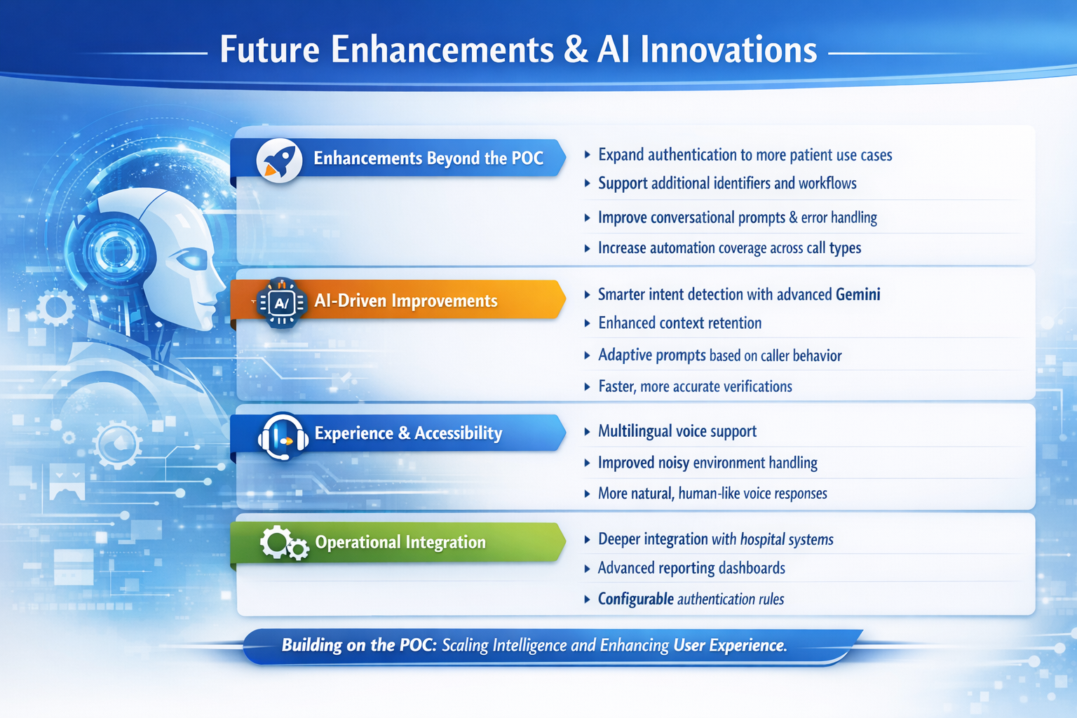 Expanding authentication scenarios and broader patient journeys Using Gemini more deeply for conversational memory and adaptive prompts Adding multilingual support and accessibility improvements Improving resilience in real‑world calling environments Introducing deeper system integrations and advanced dashboards Expanding analytics for operational control and performance optimization