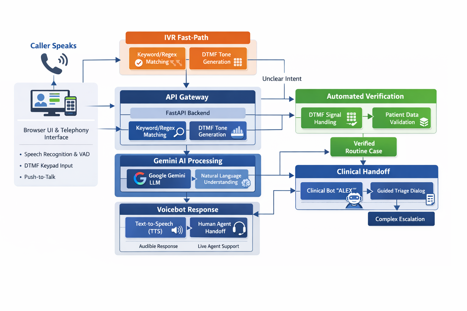 Automated Authentication Patient identifiers are captured and verified using secure DTMF handling and patient‑data checks. Routine authentication cases are completed automatically at this stage. Clinical Handoff (ALEX) If clinical assistance is required, the system hands off to ALEX, a guided clinical bot that follows structured triage flows while leveraging Gemini for natural conversational responses. Response & Escalation All responses are converted to speech via a TTS engine. When necessary, calls are smoothly transferred to a live agent with full context preserved.