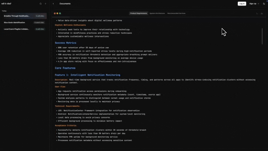 - Context generation - The app provides thorough documentation for direct use with vibe coding tools, bridging the gap between ideas and AI execution.