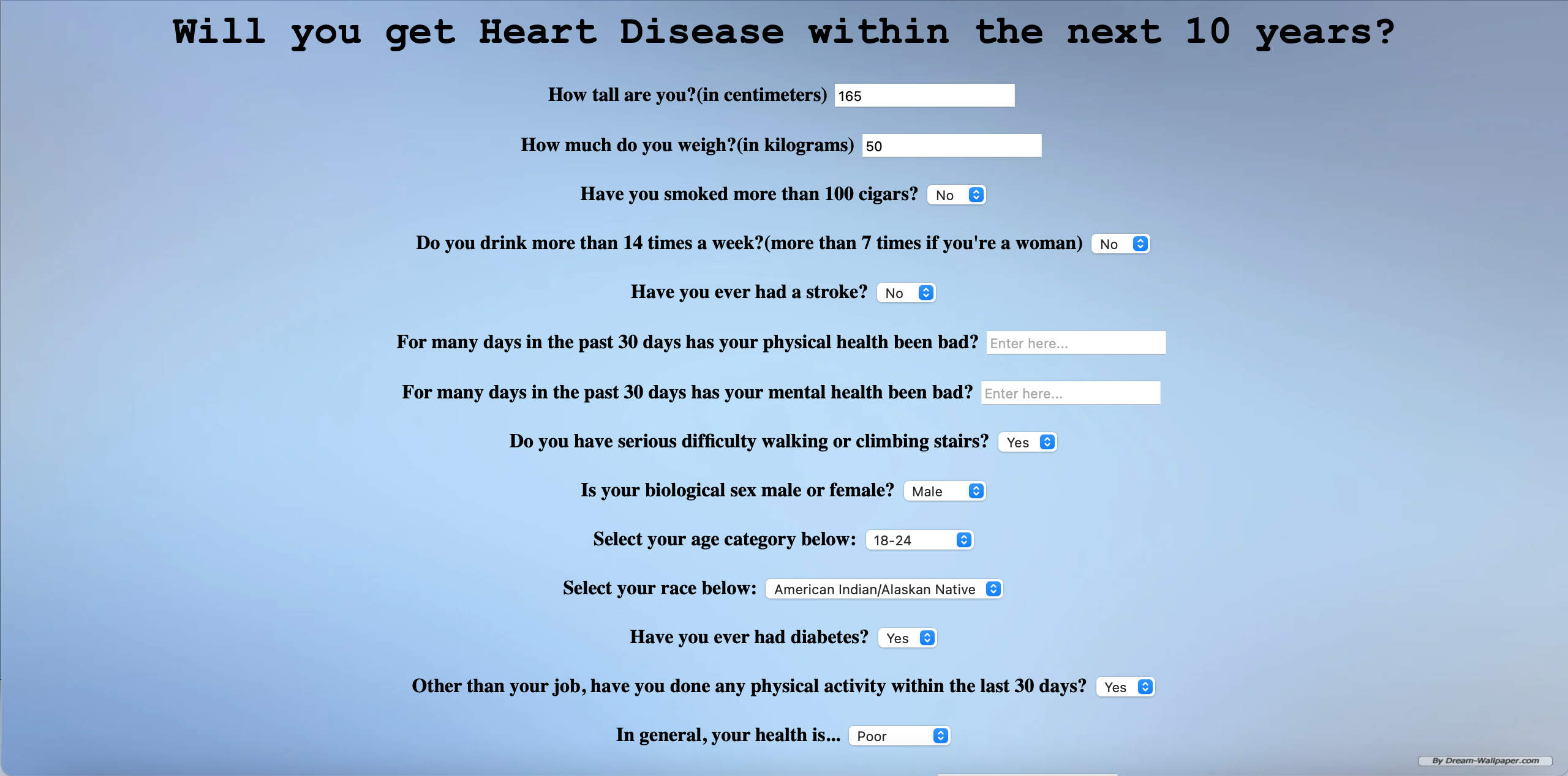 After entering in answers to various questions, users then receive a percentage risk of getting heart disease.