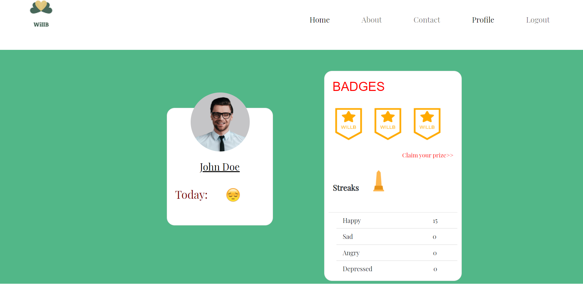 WillB is a platform where users can track their moods. They will select what they are feeling right now and according to their preferences, the system will provide them with things they can do to improve their mood.