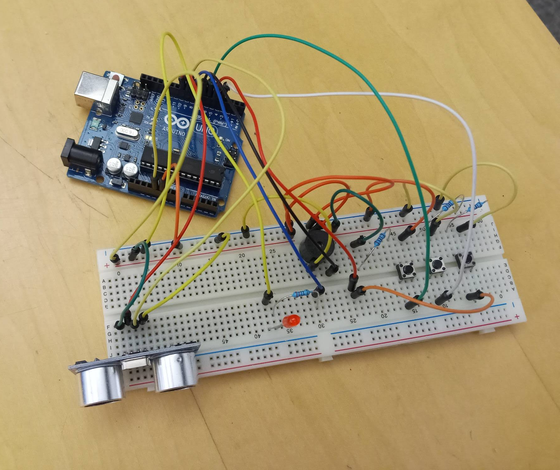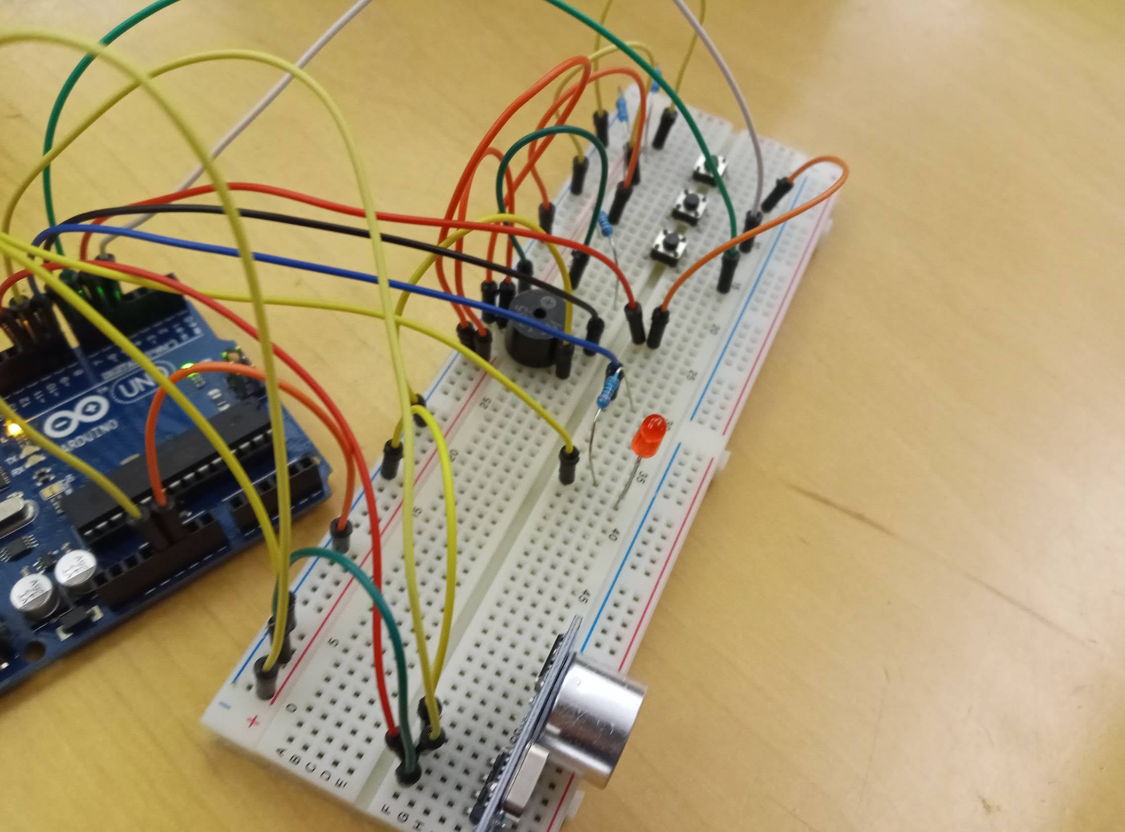 I built the project using Arduino by following a tutorial online to convert ultrasonic information to distance followed by logic which would give current to my LED and buzzer. The push buttons are a sort of pass word protected break which I implemented with branches. I used Ohms Law and the internet to determine what kind of resistors I would need for my LED and pushbuttons, and used the digital ports on the Arduino to send current.