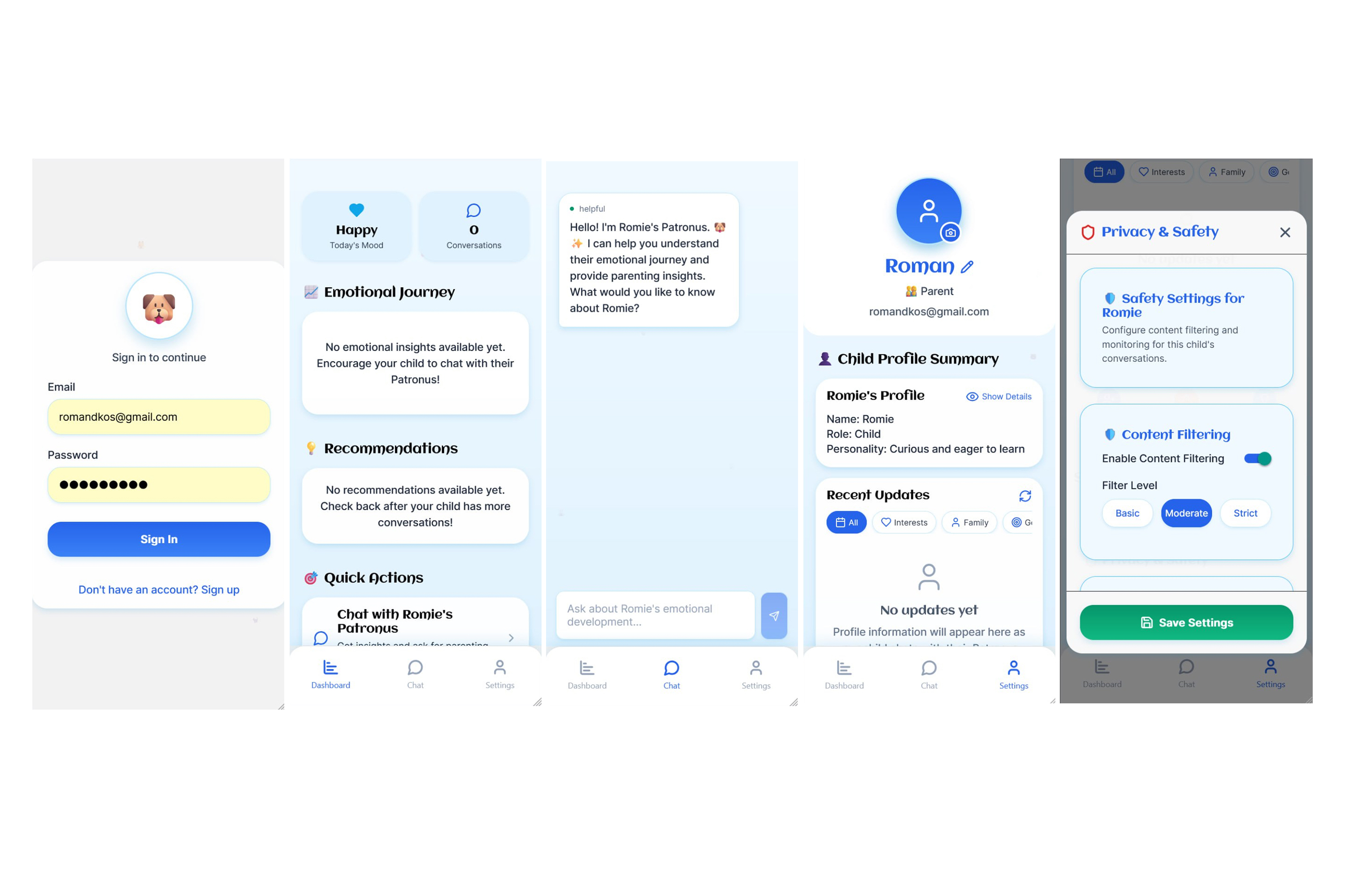 • Build a full parent dashboard with insights, mood graphs, topic editing