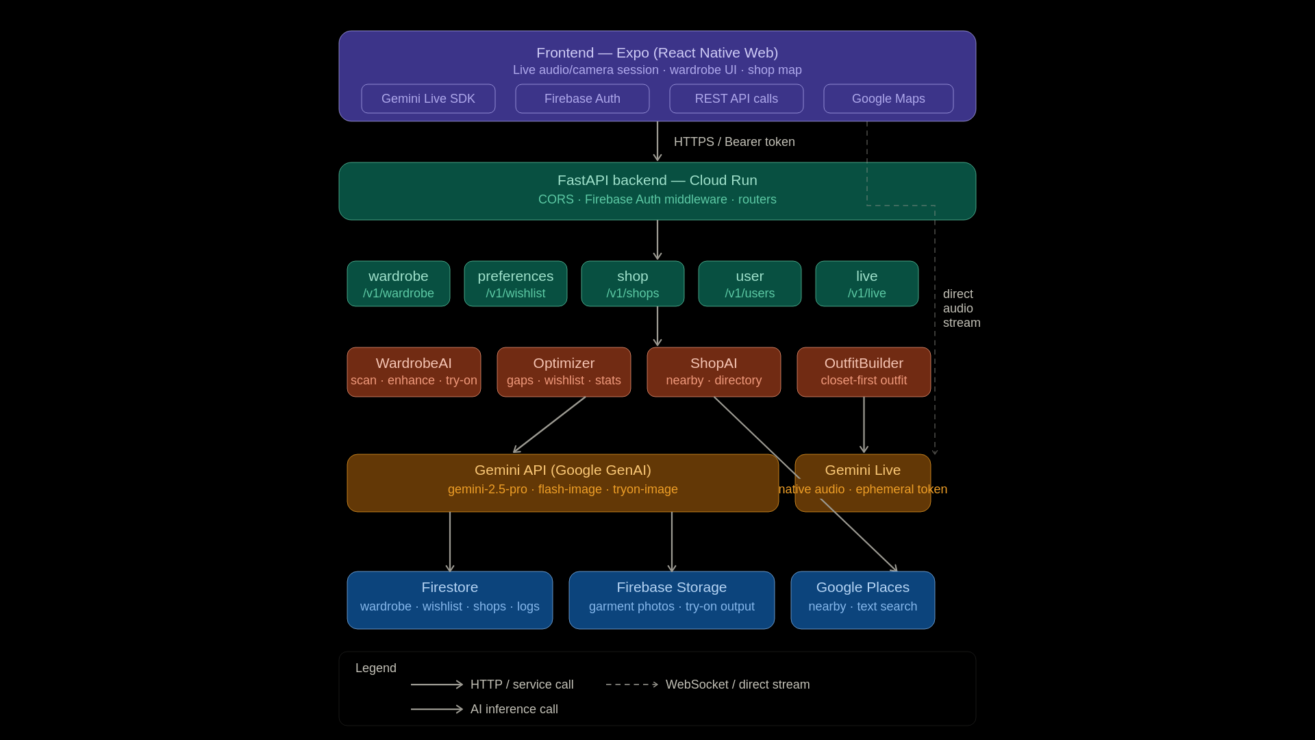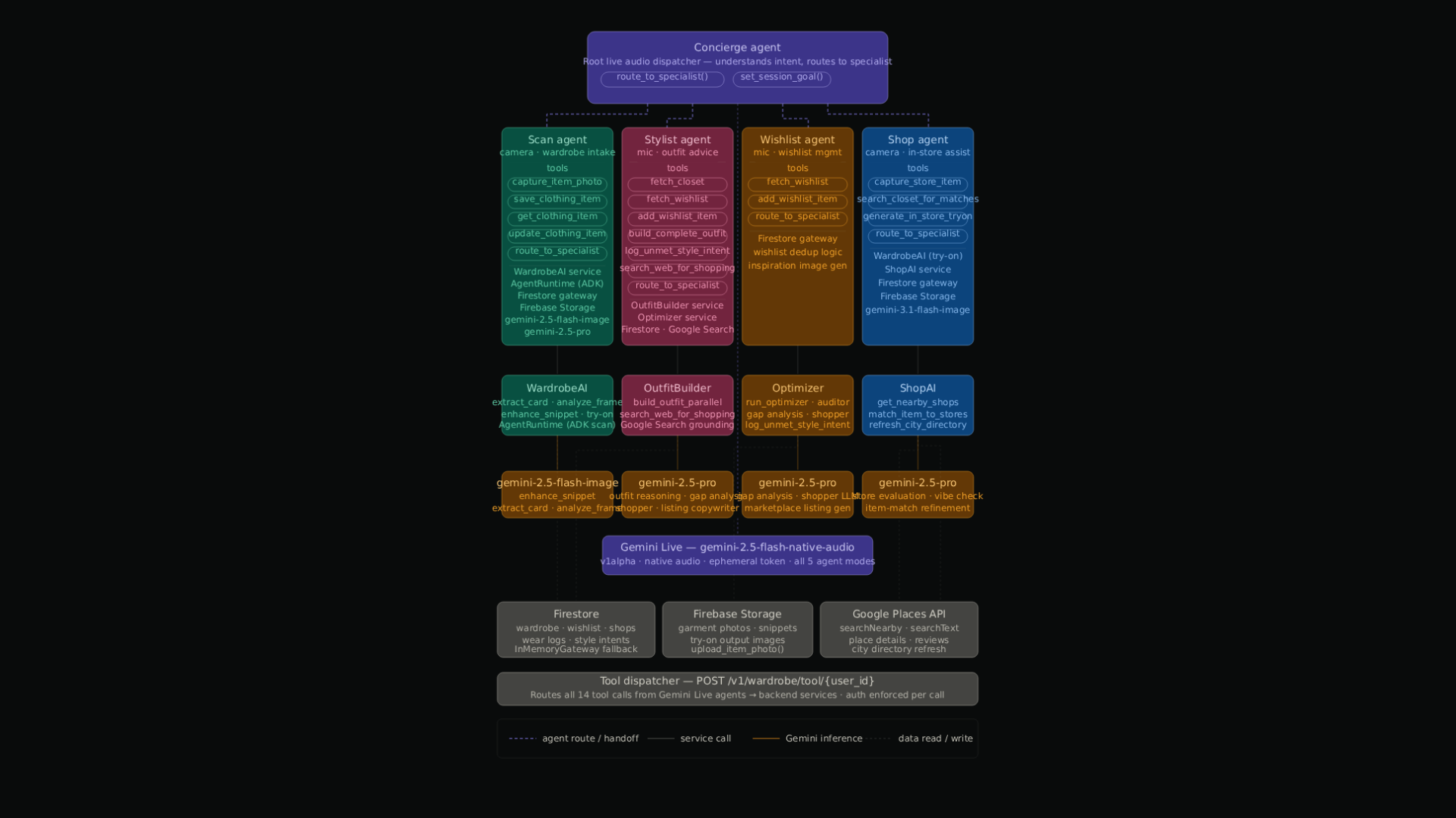 Everything is deployed on Google Cloud. The backend runs in a container on Cloud Run. The wardrobe data and user state are stored in Firestore.