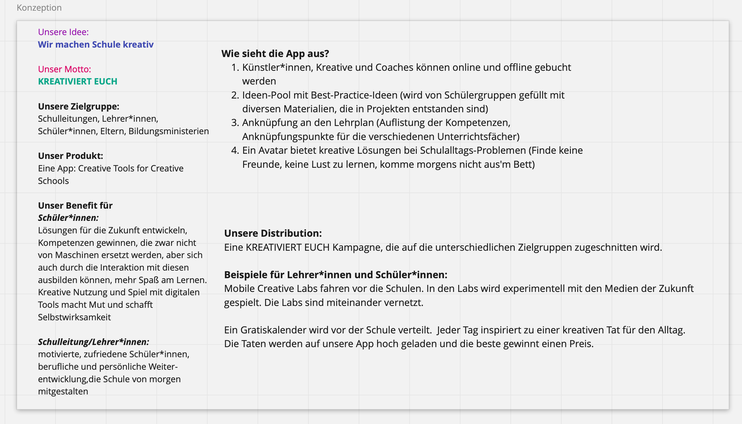 Wie ist der Lösungsansatz entstanden? Sehr schnell war klar, dass allen Teammitgliedern ein kreativer Geist in der Schule von heute fehlt. Alle sprühten zu Beginn vor Ideen, was es an kreativen Projekten in der Schule geben sollte und welchen Benefit solche Projekte für alle Beteiligte hat. Nun galt es die Ideen zu bündeln. Zu Beginn fiel es uns zunächst schwer, das genaue Problem zu benennen. Woran scheitert es, dass so wenig kreative Projekte in Schulen stattfinden oder warum sind gute kreative Initiativen nicht sichtbar? Leitfragen waren somit: wie können wir die guten vorhandenen Ansätze sichtbar machen? Welche Tools brauchen Lehrer*innen und Schulleitungen um im Rahmen der Lehrpläne kreative Projekt umzusetzen? Wie kann die Hemmschwelle für Schüler*innen möglichst niedrig gestaltet werden, damit sie Lust und Freude haben sich mit kulturellen und kreativen Fragestellungen auseinanderzusetzen?