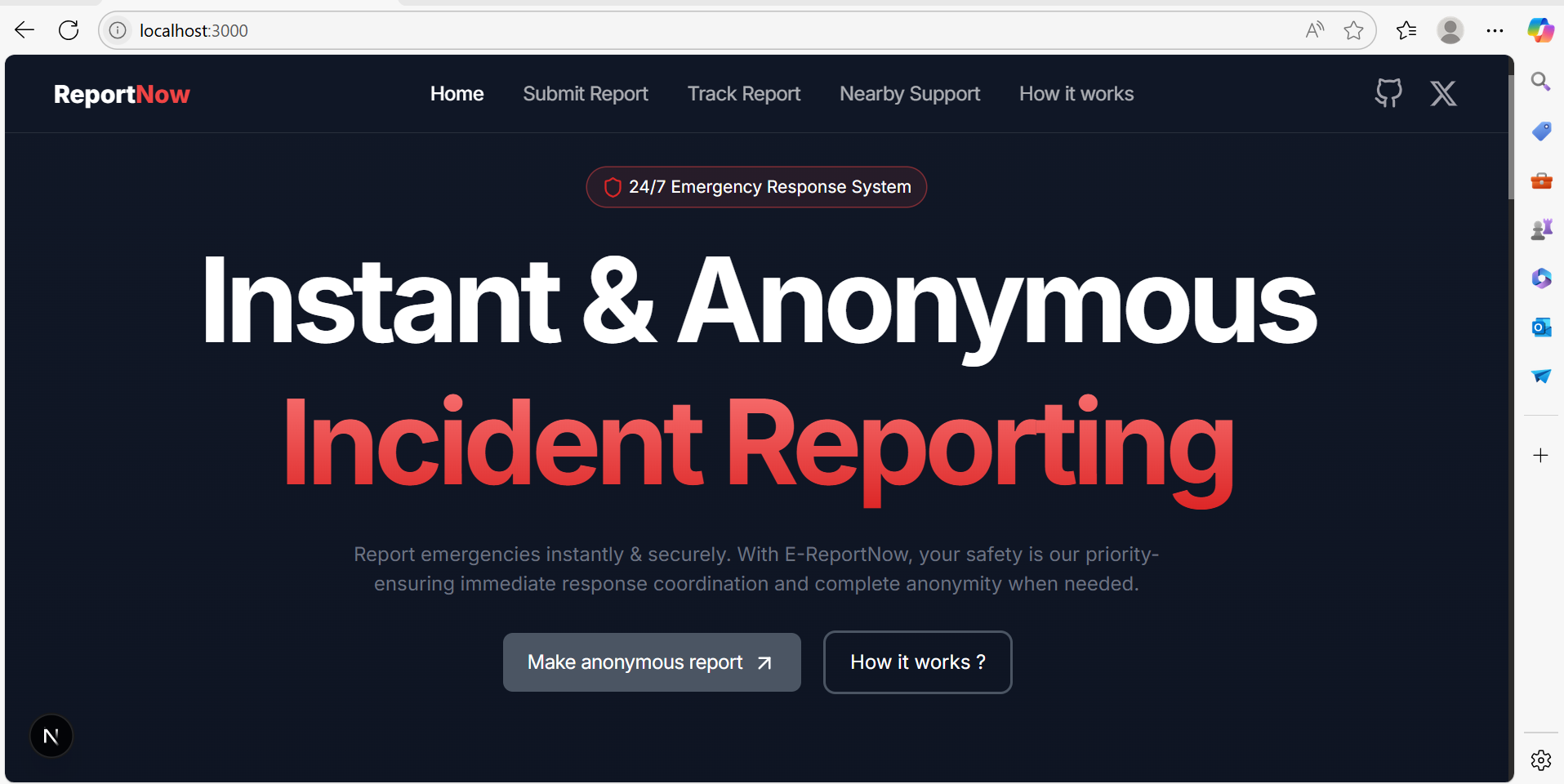 E-Report is an AI-powered web application that allows users to report incidents simply by uploading an image. Using Gemini LLM, the system analyzes the uploaded image and intelligently generates a structured incident report including: a. Title b. Description c. Incident Category Users can edit and review this information before submitting it. Beyond reporting, the platform provides: a. Real-time incident tracking b. Live location sharing c. Instant access to nearby emergency services such as hospitals, police stations, fire stations, and pharmacies via the Here API The platform is built for scalability and reliability, fully containerized with Docker for easy deployment across environments.