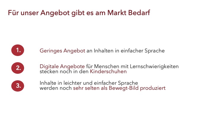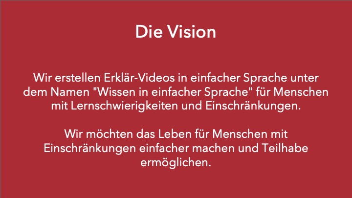 Über unser Angebot an Erklärfilmen hinaus würden wir gerne Co-Kreation-Workshops gemeinsam mit Menschen mit Einschränkungen durchführen, um eine inklusive Erstellung von Wissen zu fördern. Dabei können wir auch Inhalte von anderen Produzenten mit aufnehmen.