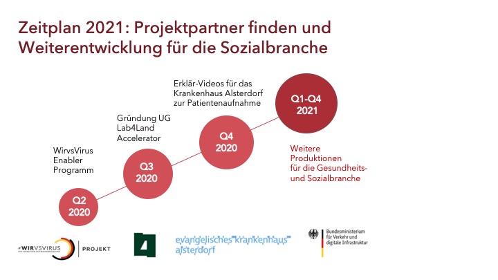 Wir schließen die Entwicklung der Plattform bis Oktober 2021 ab und arbeiten an einer erweiterten Version des Angebotes für die Sozial Industrie und Stadtverwaltungen in der wir Verwaltung und Alltagsthemen erklären wollen. Für den nächsten Schritt wünschen wir uns Partner aus Kommunen, Städten, Verwaltungen, Stiftungen, dem Gesundheits- und Sozialwesen um die Lösung weiterzuentwickeln.