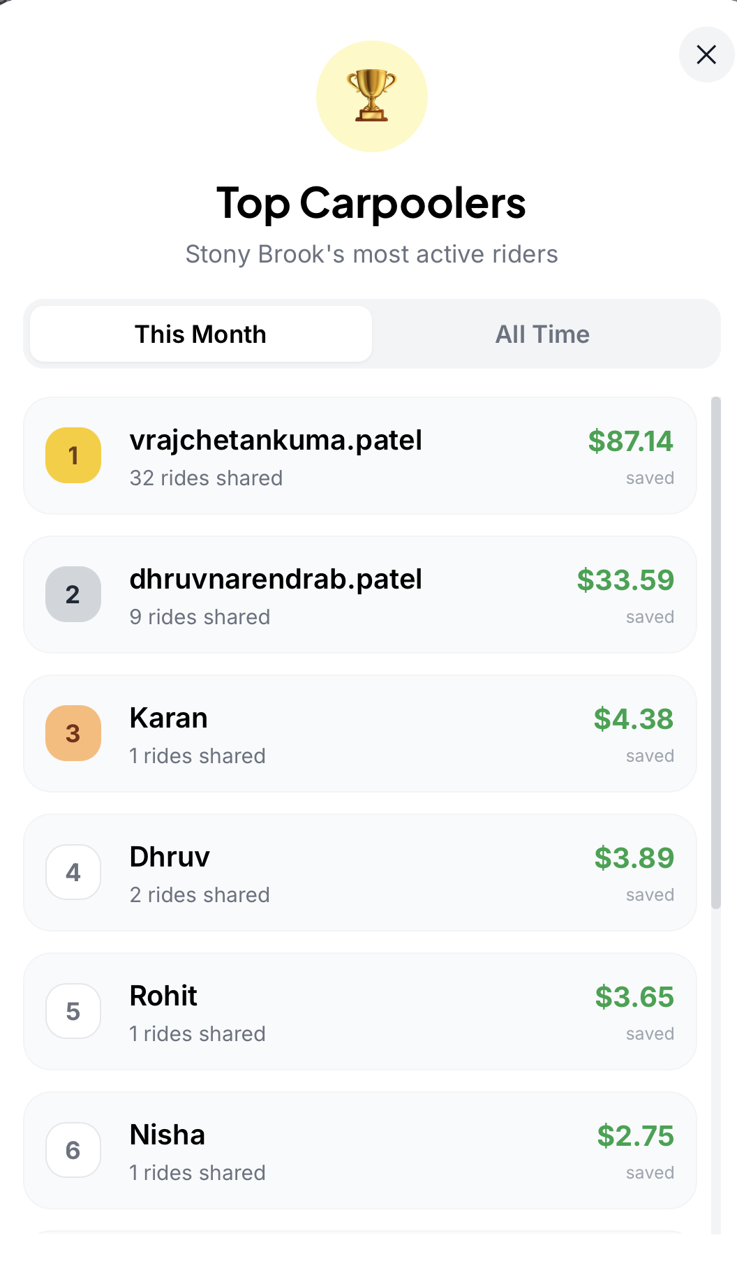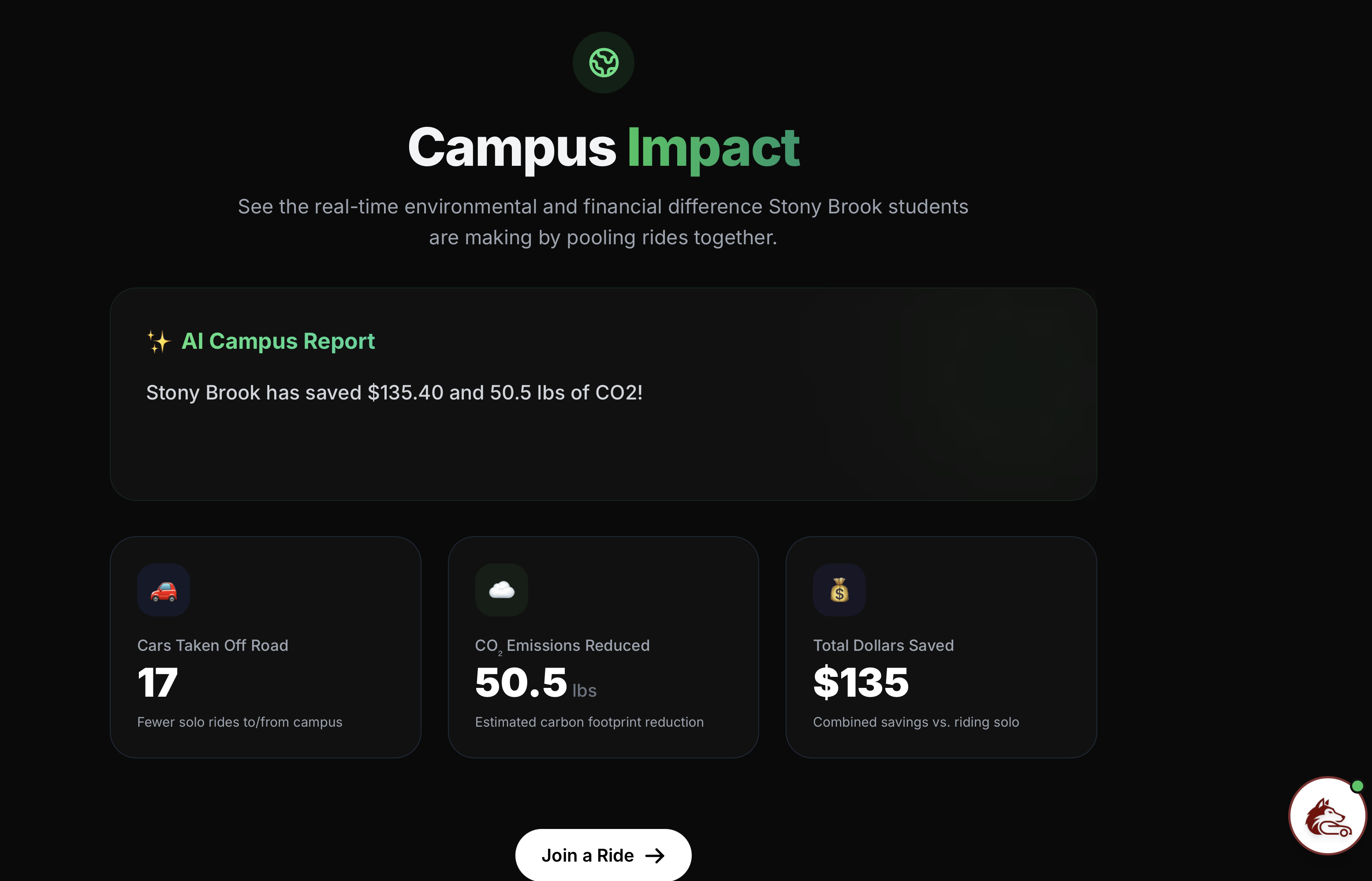 - Tangible Ecological Impact: By actively calculating and displaying actual lbs of CO2 avoided per matched ride, we built a gamified system that tangibly rewards the SBU community for sustainable behavior.