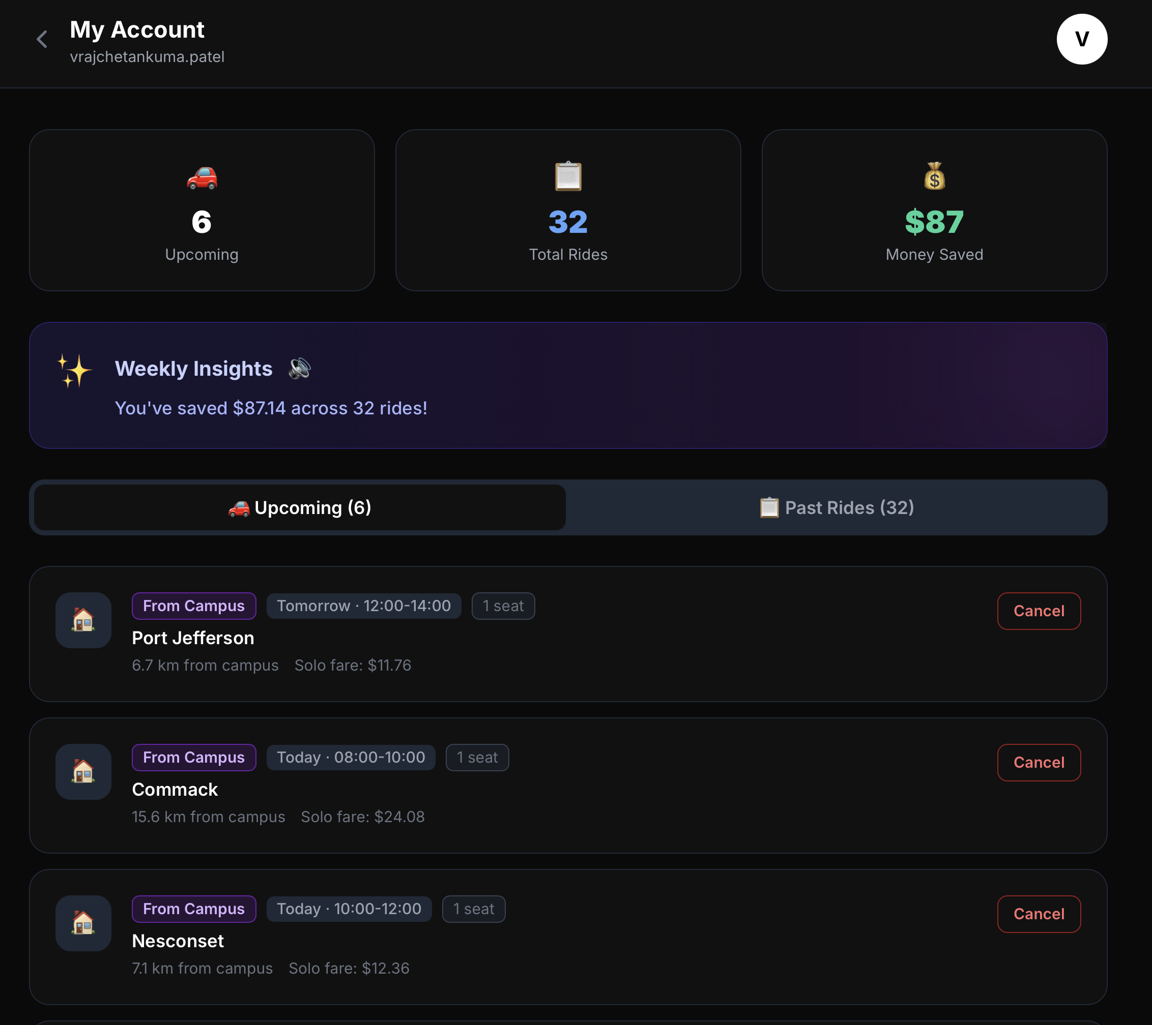 - Dynamic Match Announcements: When a student is matched, a hyper-realistic TTS announcement orchestrates the victory: "Great news Vraj! You've been matched with 2 other riders. You'll save $4.50!"