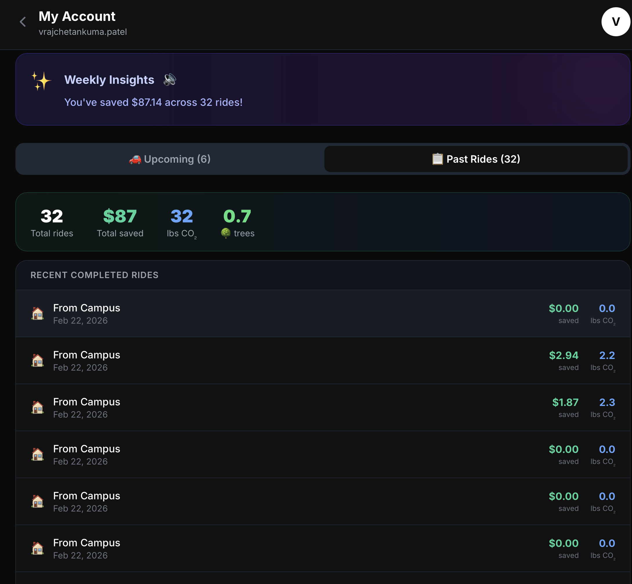 - Verifiable CO2 Tracking: Every shared ride computes the precise estimated carbon savings (lbs CO2 avoided), with a strict logic gate ensuring solo riders correctly show $0 savings.