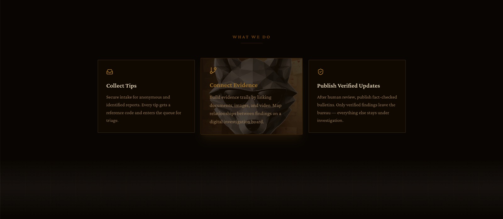 WolfTrace is a noir-styled campus incident workspace that transforms tips into cases and evidence into connected trails.